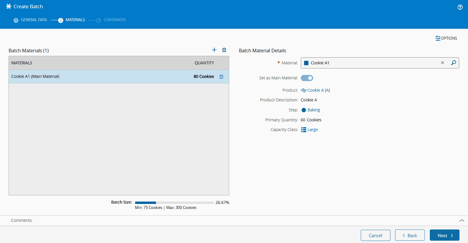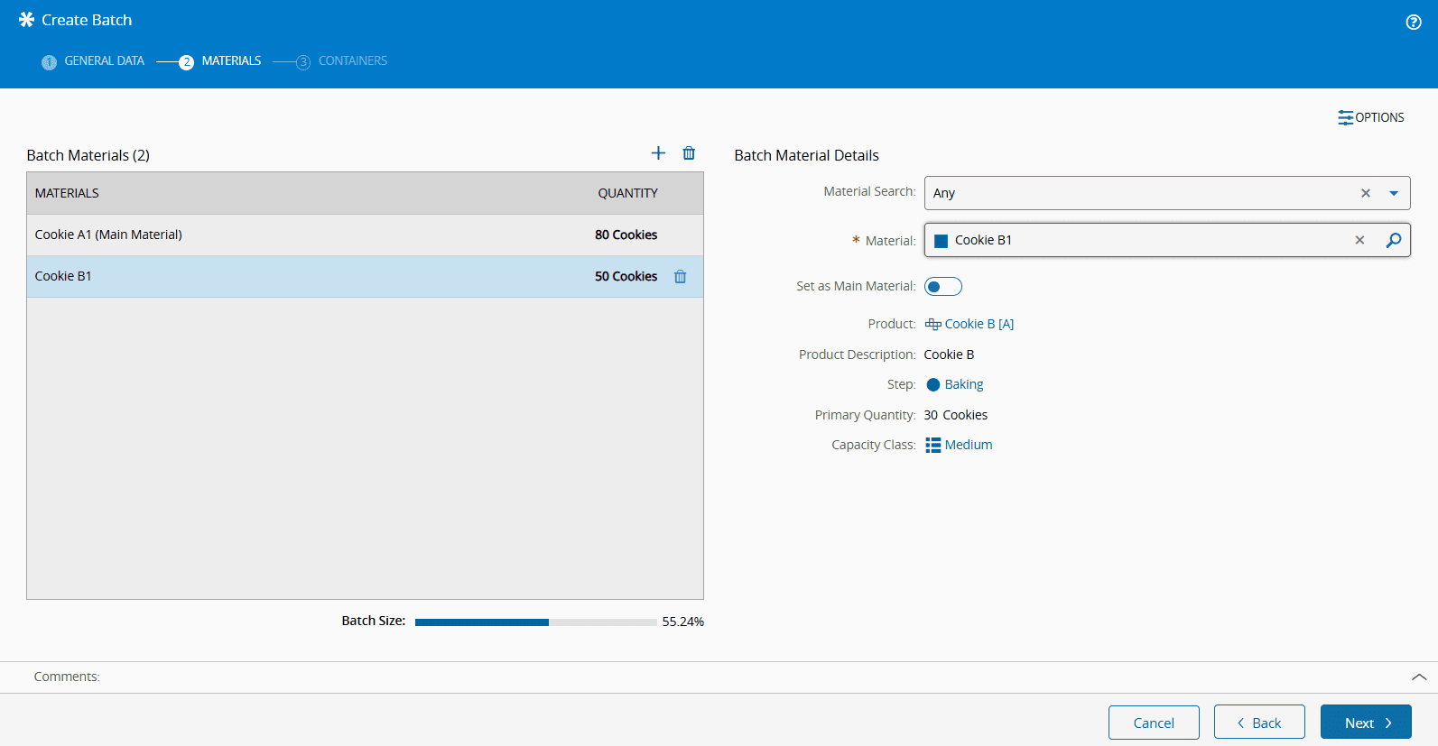 If multiple Materials are selected, one must be designated as the Main Material, by enabling the Set as Main Material toggle button. This action establishes the Product and the Capacity Class of the Batch. If a Main Material is already set, it must be changed before it can be removed.