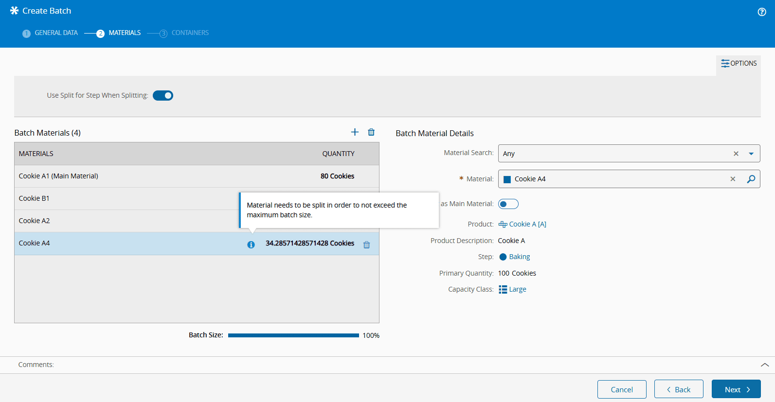 Materials can be added as long as the total does not exceed the Batch Size. If Material Split Mode was set to Allowed during Batch configuration, the primary quantity of the last-added Material will be adjusted to fit within the Batch Capacity. If Material Split Mode is set to Not Allowed and the Batch Capacity is exceeded, the system will not allow you to continue until meet the requirements. By default, the system executes a Split for Step Future Action, instead of the Split Future Action, meaning the Material is split while in the Queued state and merges back once Processed.