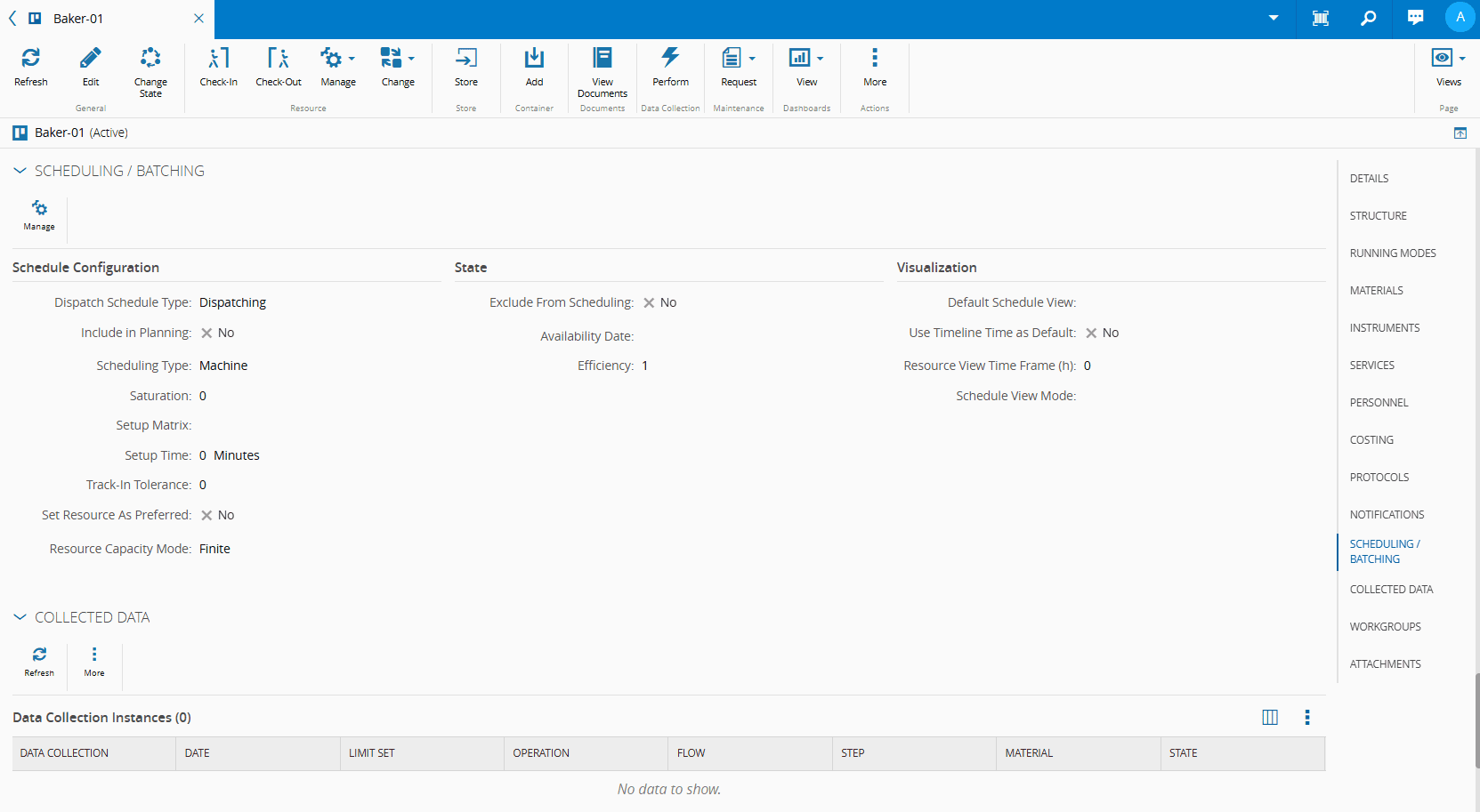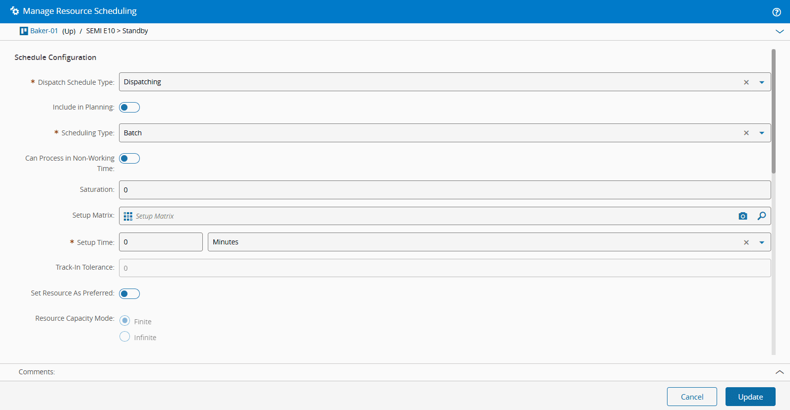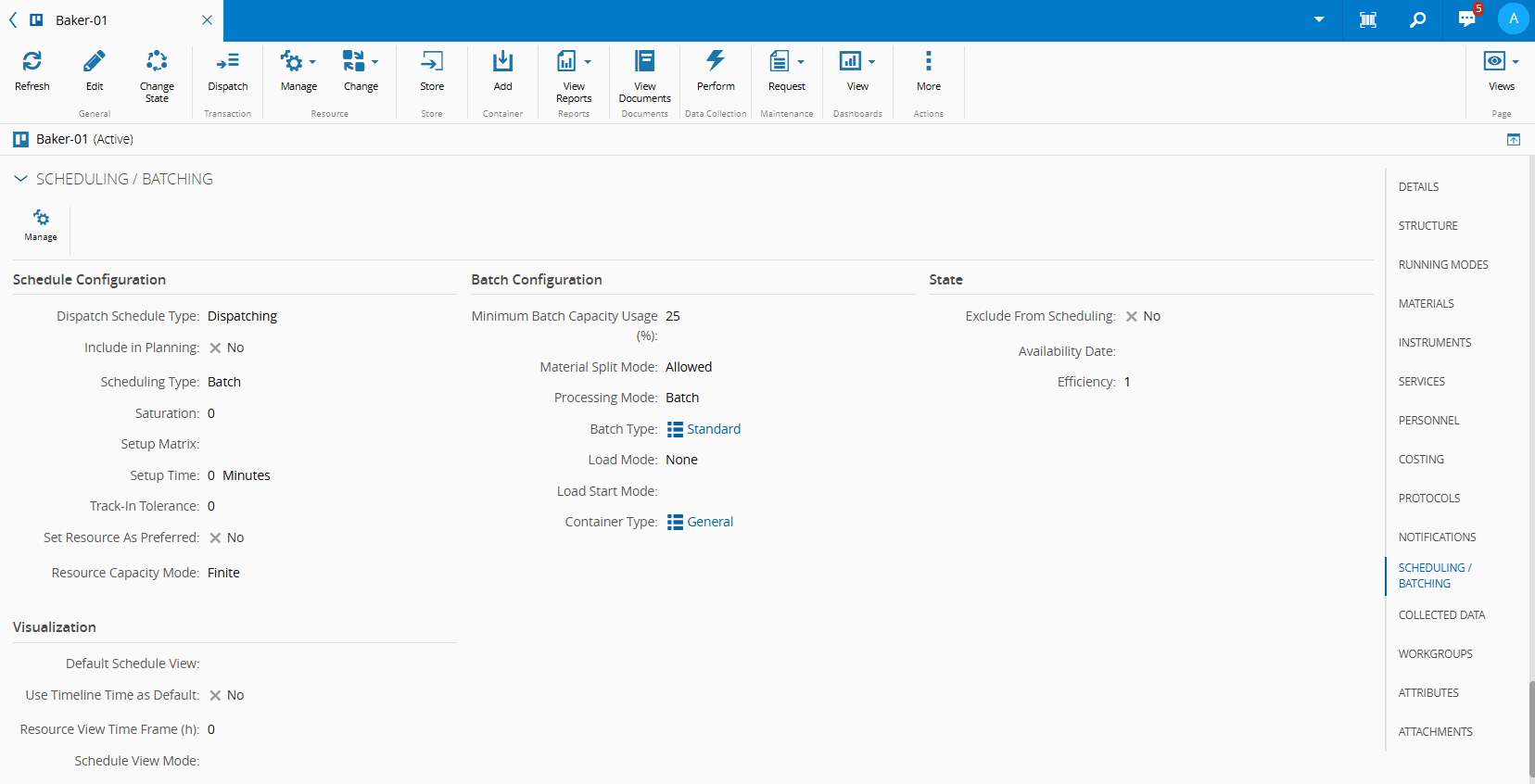 To begin, select a Resource — such as Baker-01 — and navigate to the Scheduling/Batching section. Select the Manage button and, within the Schedule Configuration section, change the Scheduling Type to Batch.