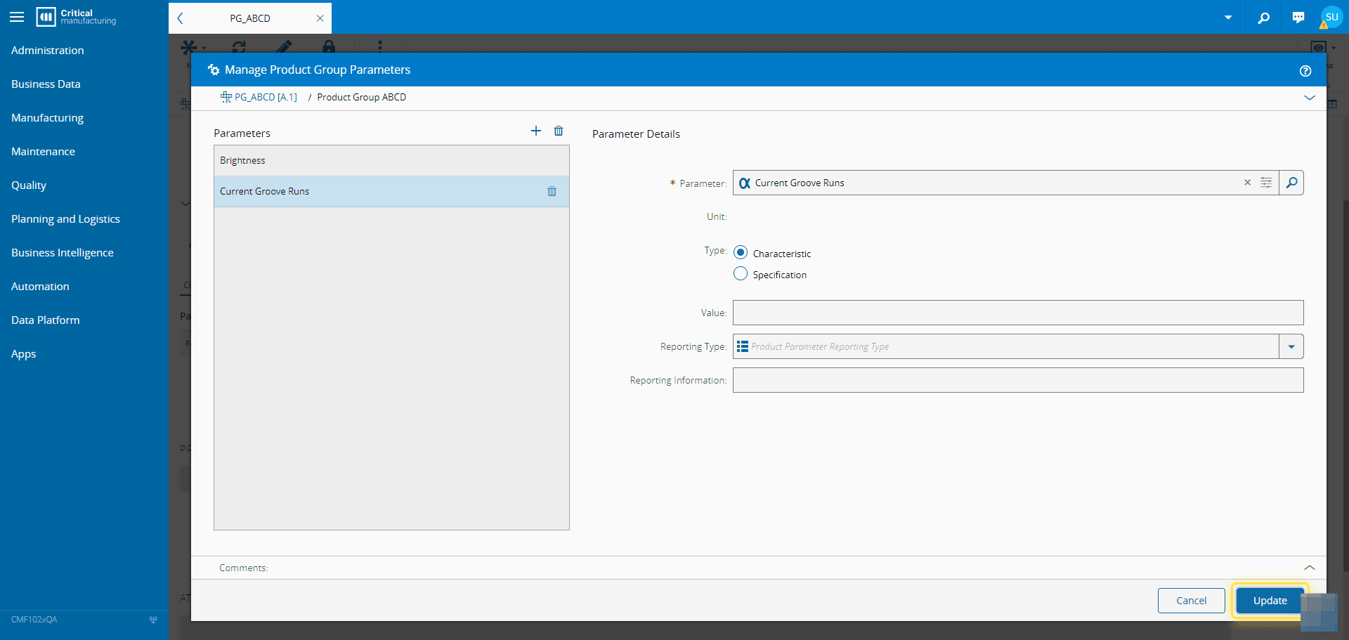 For more information, see Manage Product Group Parameters - Critical Manufacturing Documentation Portal ⧉