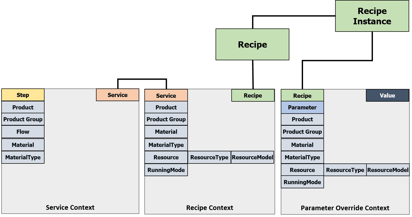 A Material requires a Service at a Step, as defined in the ServiceContext Smart Table, and this Service is provided by a Resource. For this Service, in order to provide the necessary setup and configuration information to process a Material in a Resource, the Recipe Context is defined.