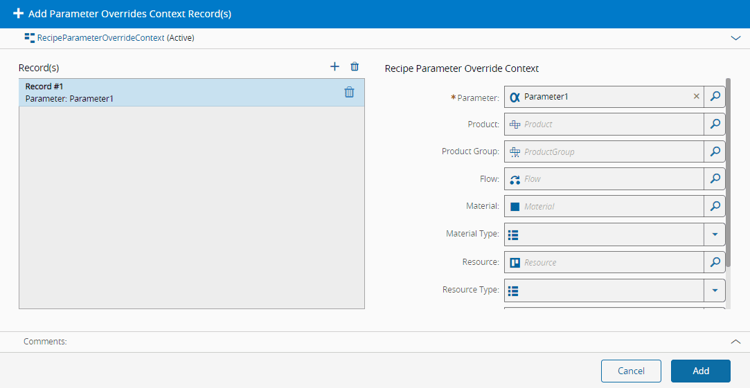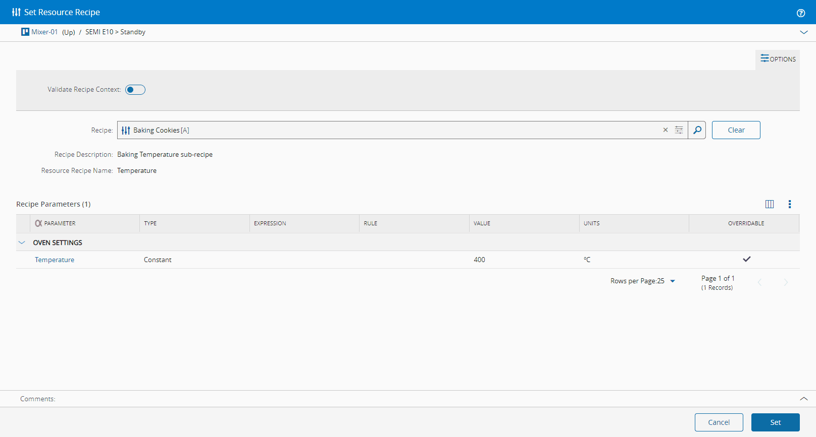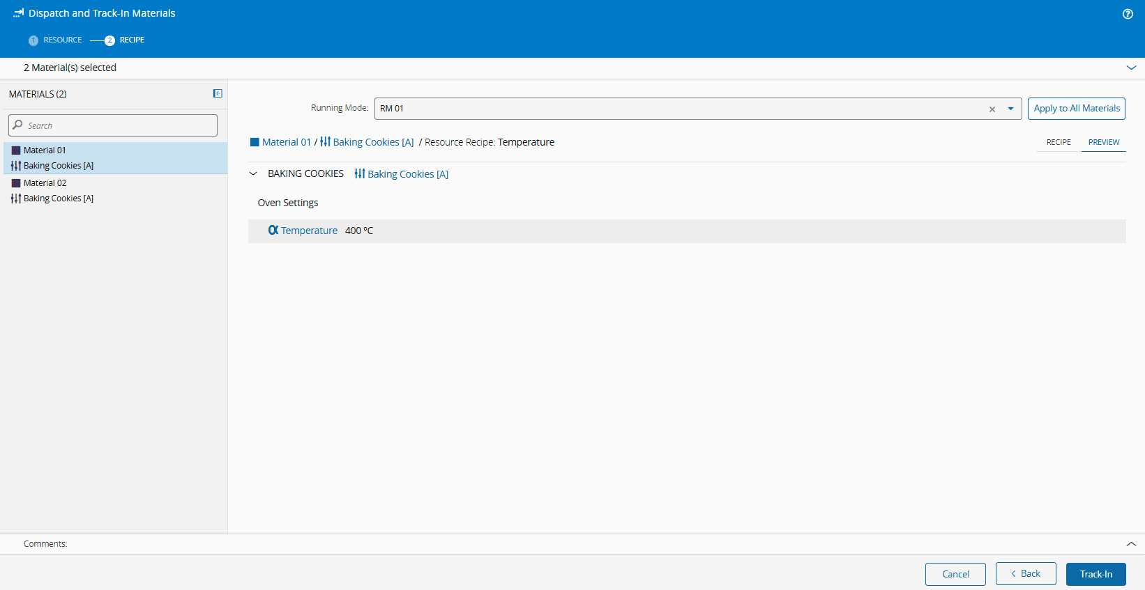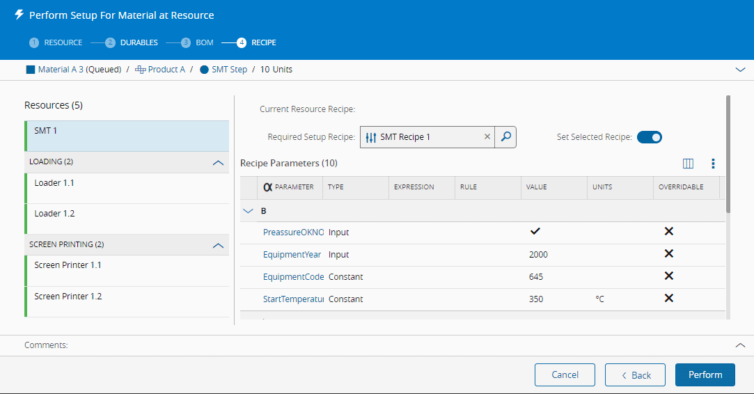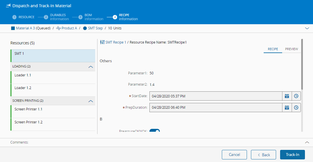A Parameter needs to be marked as Overridable on the Recipe Parameters to be referenced on the Recipe Parameter Override Context table. If the automation mode from the resource is Online, track in will be done automatically. The recipe is validated if the recipe management and Verify Material Recipe at Track-In are enabled.