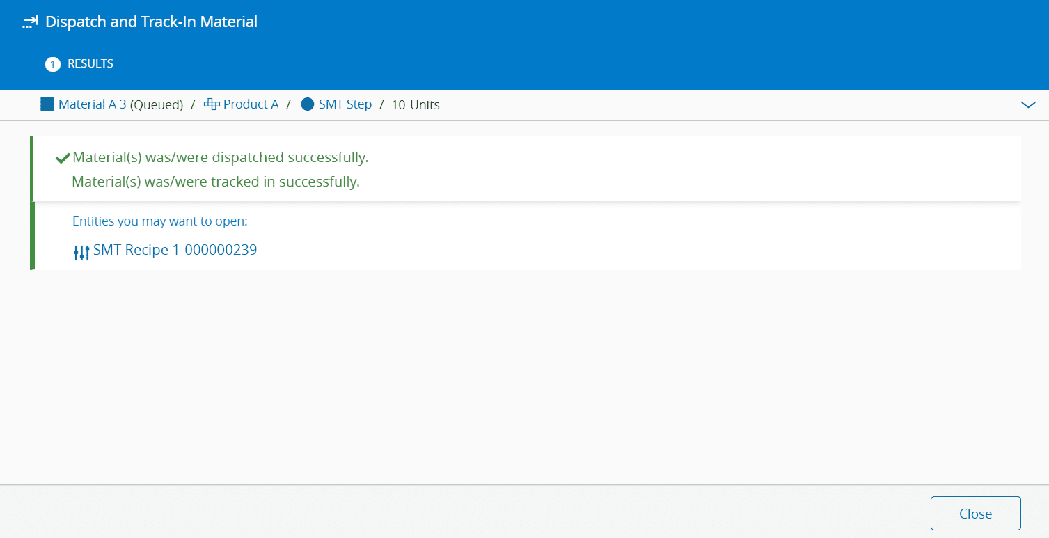 When a Material is tracked-in, the Recipe defined in the RecipeContext is displayed, as shown in the figure below.