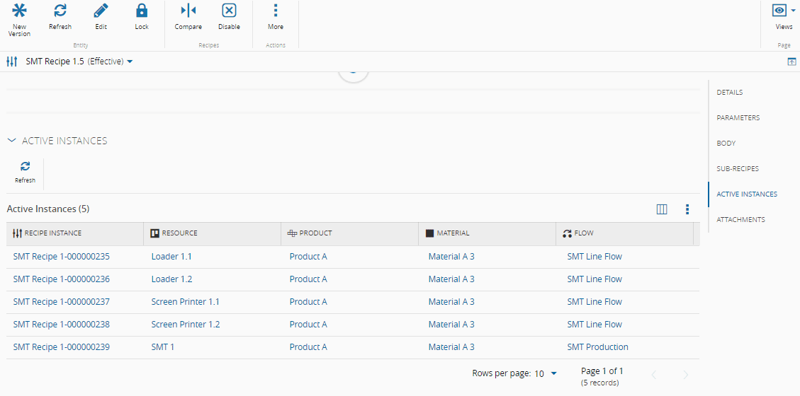 For a particular Material Context, the MES creates a Recipe Instance when performing a Material track-in. The Recipe Instance stores the used Recipe Version and Parameter information for traceability and analysis purposes.