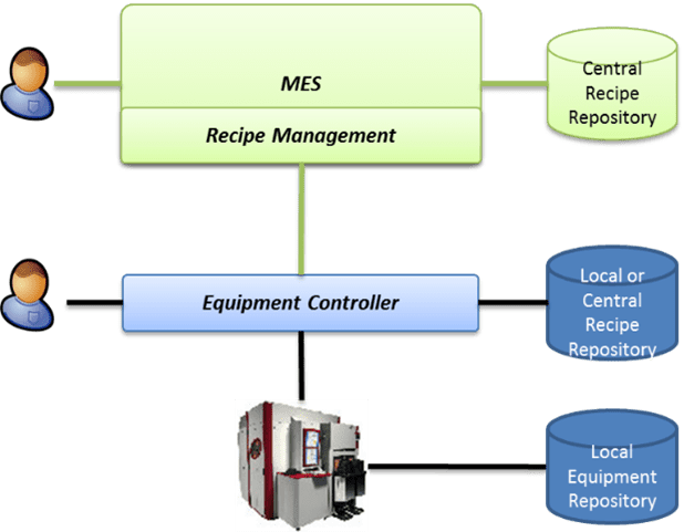 Recipes can be stored and edited centrally in the MES, but often it's the case that they can be edited only in the equipment or equipment controller. The system must therefore support the download and upload of Recipes from/to equipment.
