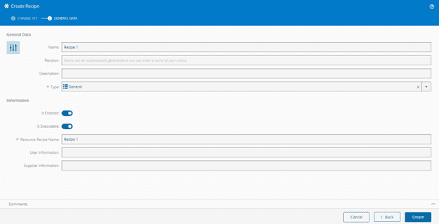 The next table describes the properties that need to be taken into consideration when creating a Recipe, the first step of Recipe creation.