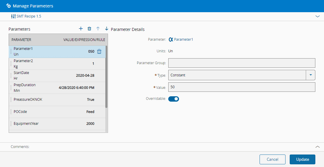 | Overridable | Defines if a Parameter is Overridable. An Overridable Parameter may have its value changed depending on the RecipeParameterOverrideContext Smart Table configuration. |