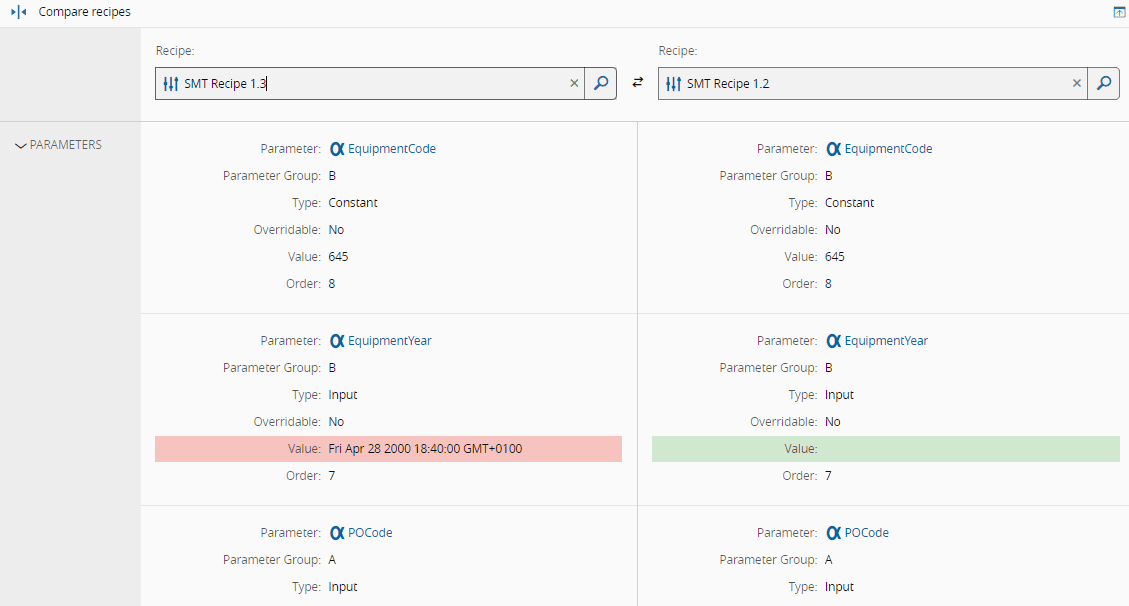 The Compare Recipes page provides the functionality to verify not only changes in Recipe Versions, but also to compare different Recipes, as shown on the figure below.