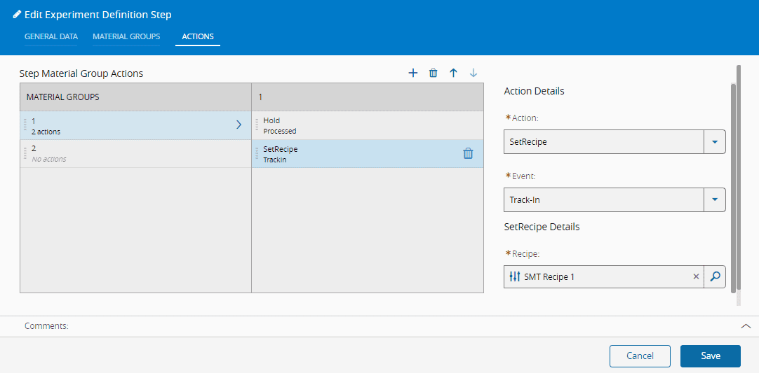 An Experiment Definition allows the User to carry out controlled variations of the production process. A typical use case for this situation is the creation of an Experiment Definition in order to test a new Recipe. This can be configured by defining the Action SetRecipe at the Track-in Event for an Experiment Definition Material Group, as shown in the figure below.