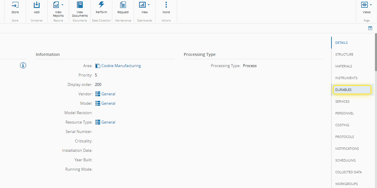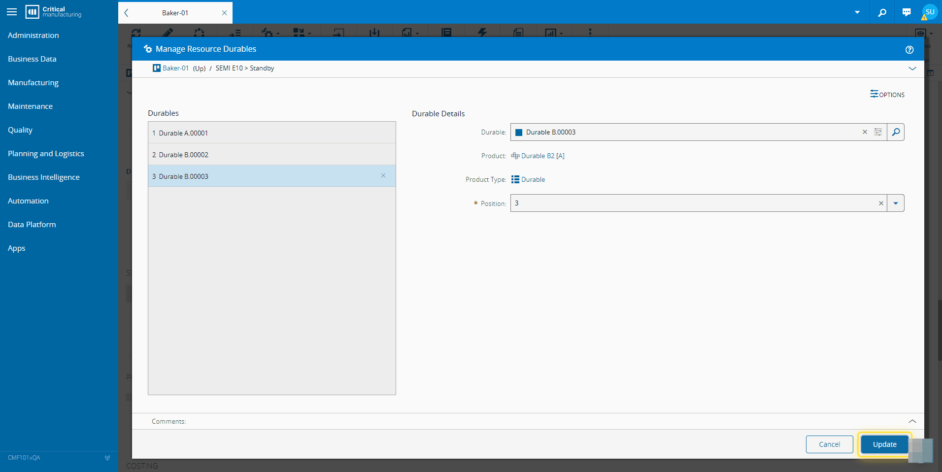 For more information, see Manage Resource Durables - Critical Manufacturing Documentation Portal ⧉