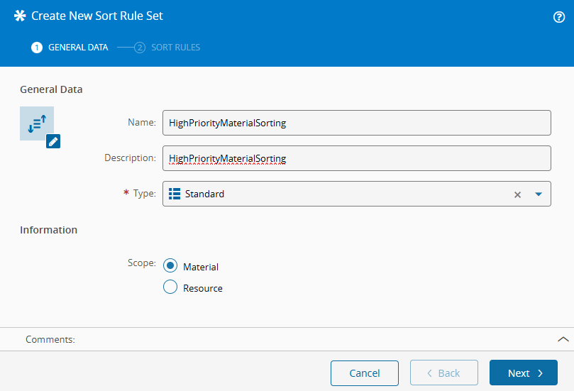 1. Provide a name for the Sort Rule Set, for example HighPriorityMaterialSorting or HighPriorityResourceSorting.
