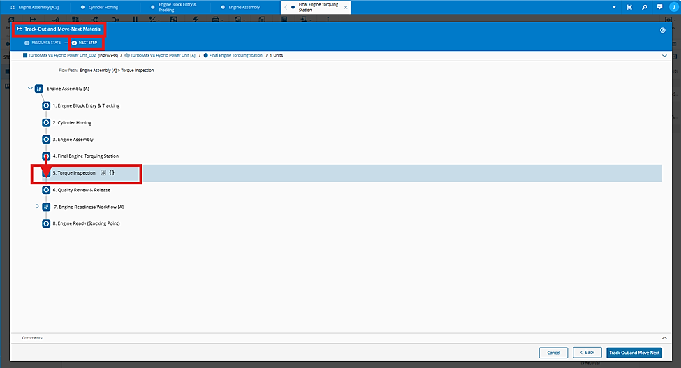 In an automotive assembly line, Engines pass through multiple production Steps. During the Cylinder Honing step, Critical Manufacturing MES evaluates whether a lot should later be inspected based on a Sampling Plan, in this case every 10th Engine. The Engines continue through assembly normally, and only the previously selected Engines perform the Torque Inspection step. This ensures machining quality is monitored without slowing down the line, as the inspection is performed at the stage where torque can actually be measured.