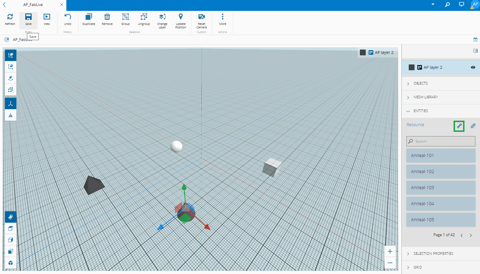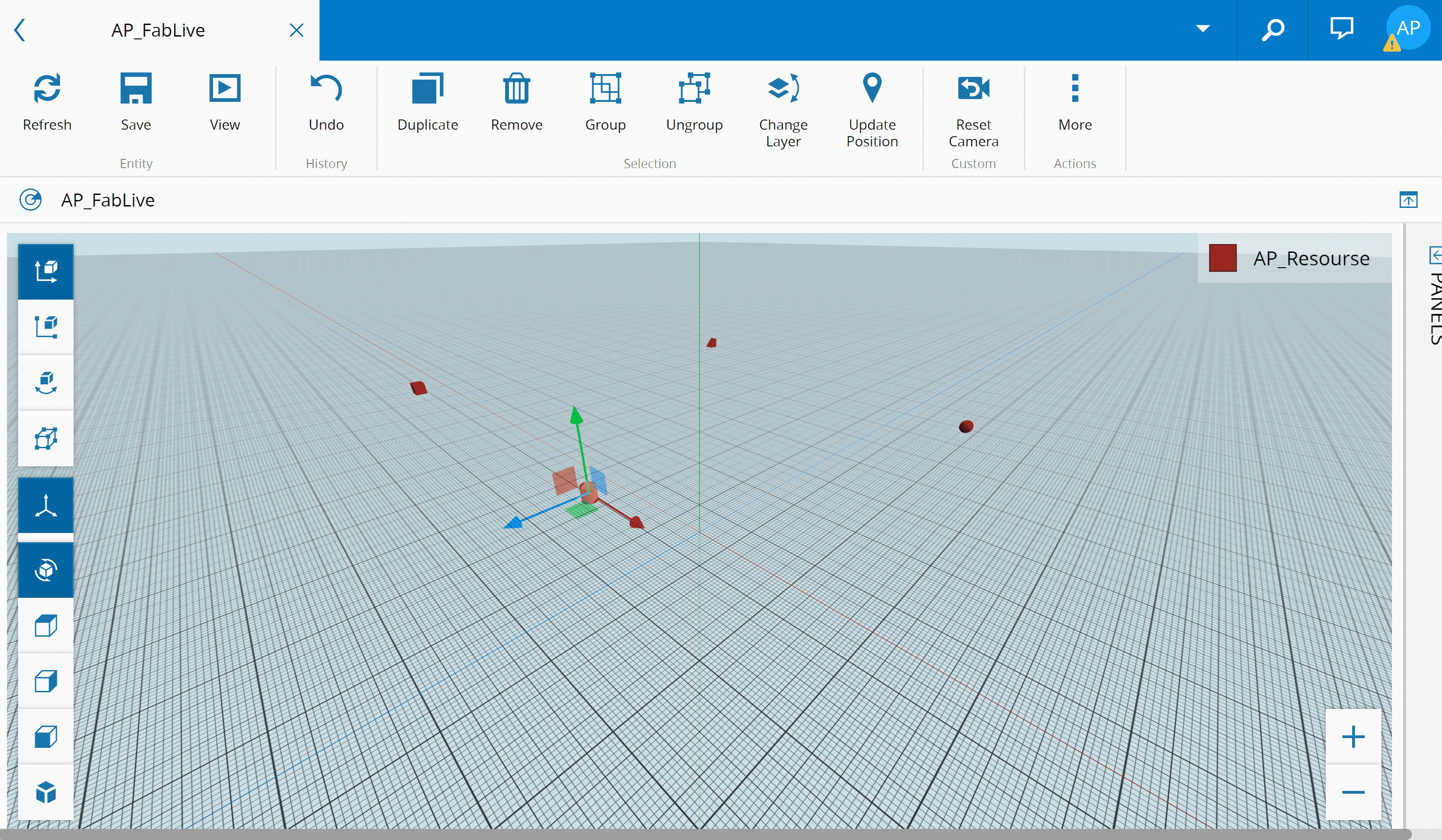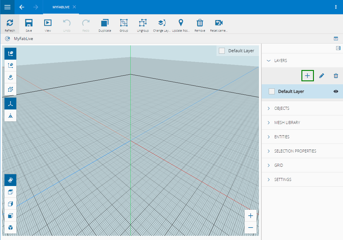 A FabLive will always contain a default layer. A default layer is useful to add static elements to the layout, such as floors and walls. To visualize system objects in the FabLive you need to add a FabLive Layer. Do so by opening and entering the needed FabLive in Edit mode and then select on the Layers panel located on the right.