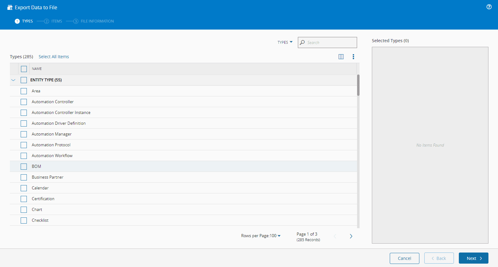 Open Master Data Export and select the object types that you want to export. You can Select All Items, which will include items that are not currently visible on the screen, or only the ones you need: