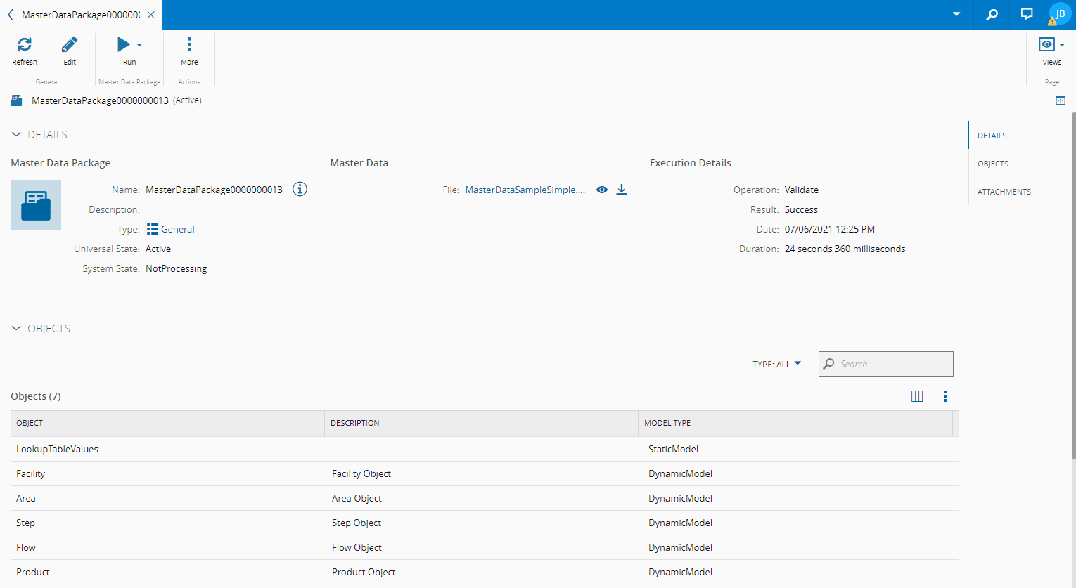 - From the main details page of the Master Data Package, select the Run drop down on the top ribbon and select Validate.