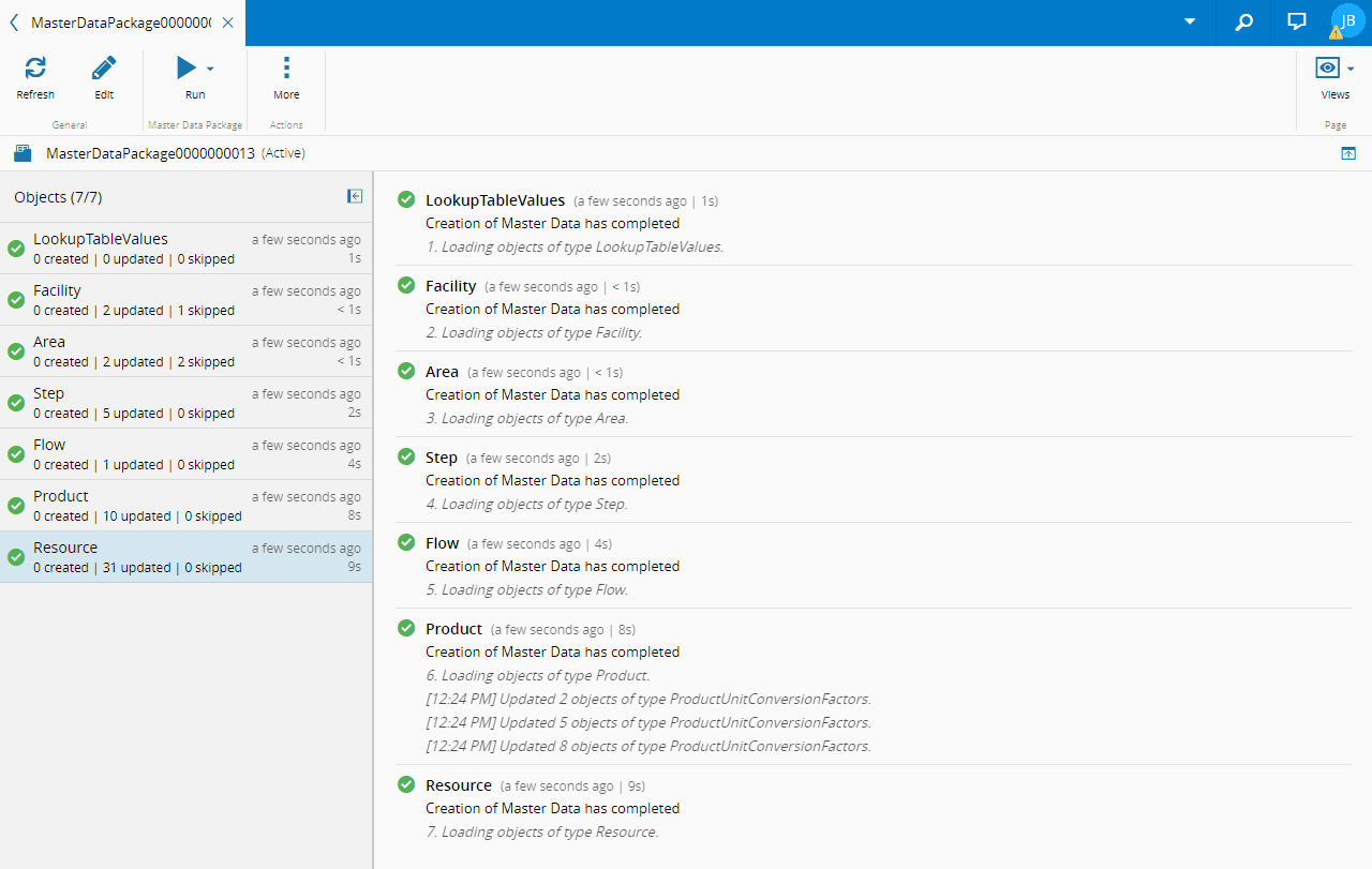 - From the main details page of the Master Data Package, select the Run drop down on the top ribbon and select Load.