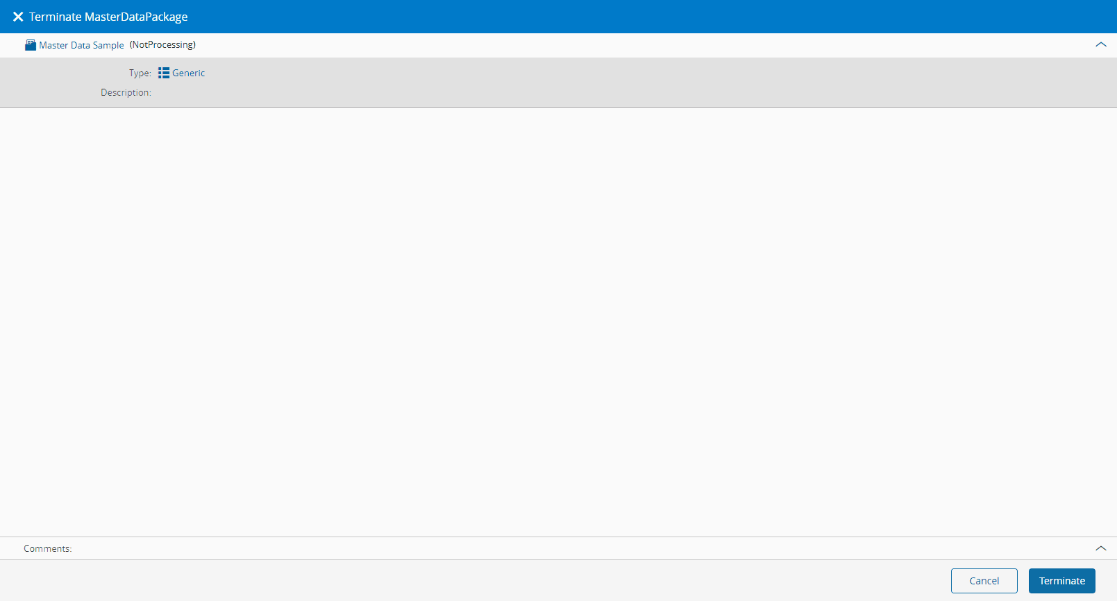 - Confirm the details and select Terminate to remove the Master Data Package.
