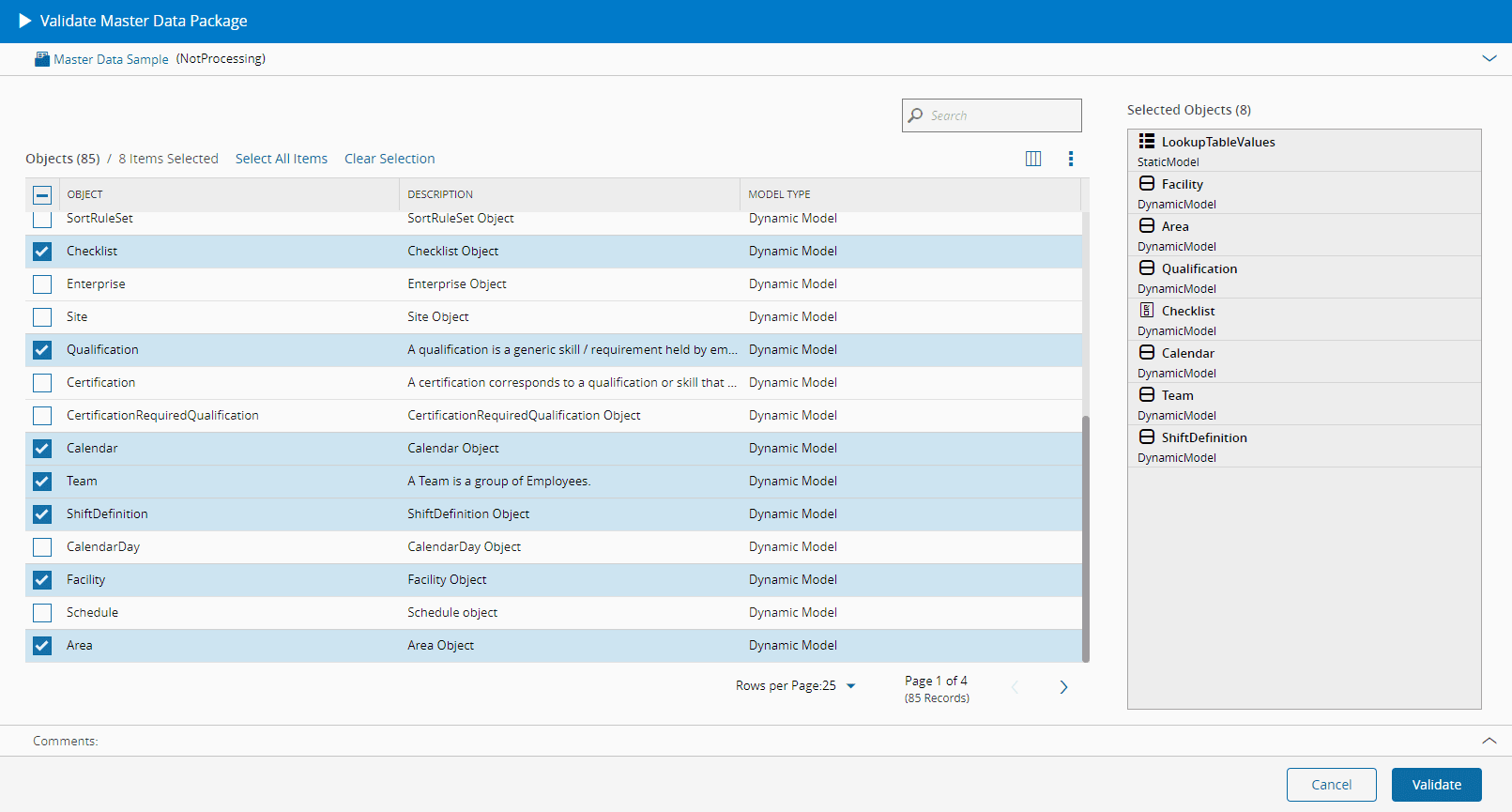 - The system will open a dialog where you can see the Entity Types available from the loaded package file. Select which of the entity types should be loaded into the Critical Manufacturing MES system and select Validate to start the process.