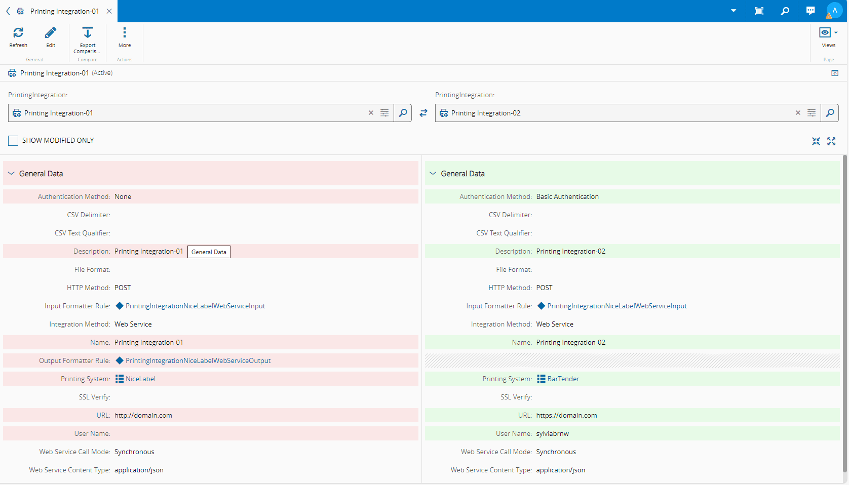 This view provides a quick visual comparison between the selected entity version and any other version that can be selected through it. You can also export the comparison results to a PDF file through the Export Comparison button on the top ribbon. For more information, see Compare Entity Versions