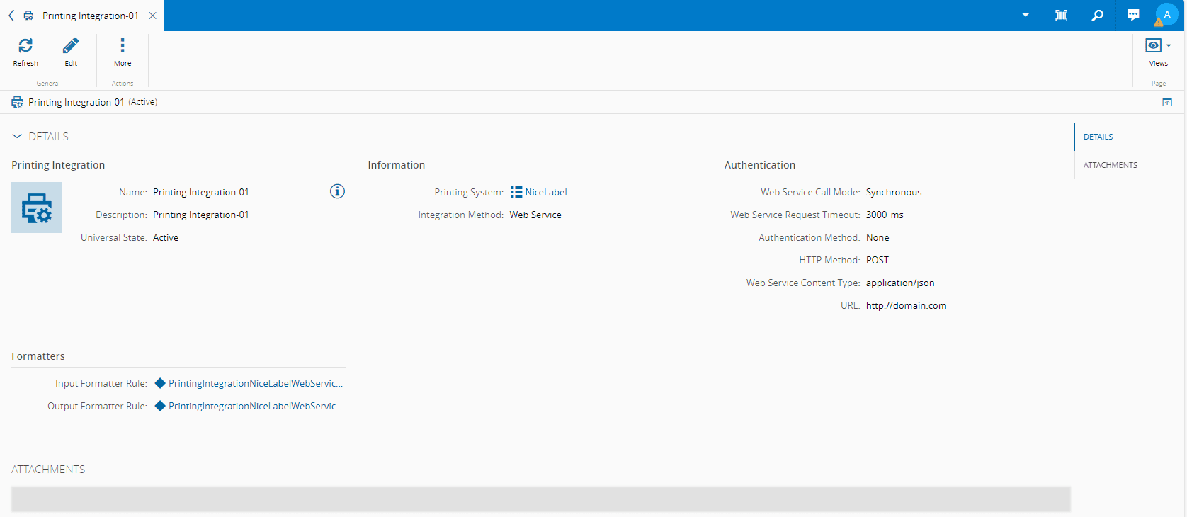 - Attachments - shows the documents that are attached to the Printing Integration object and enables you to attach additional documentation to the Printing Integration object.