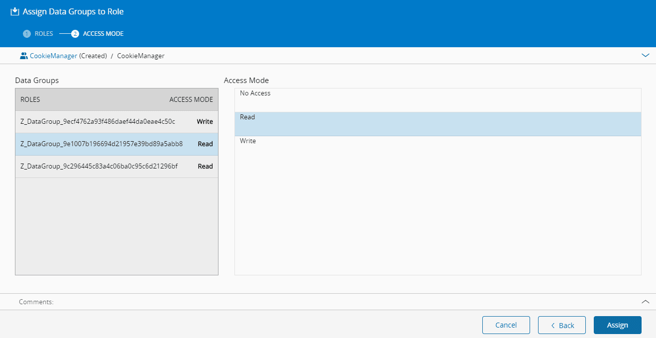 - Choose the Access Mode for each of the Data Groups to assign to the current Role.