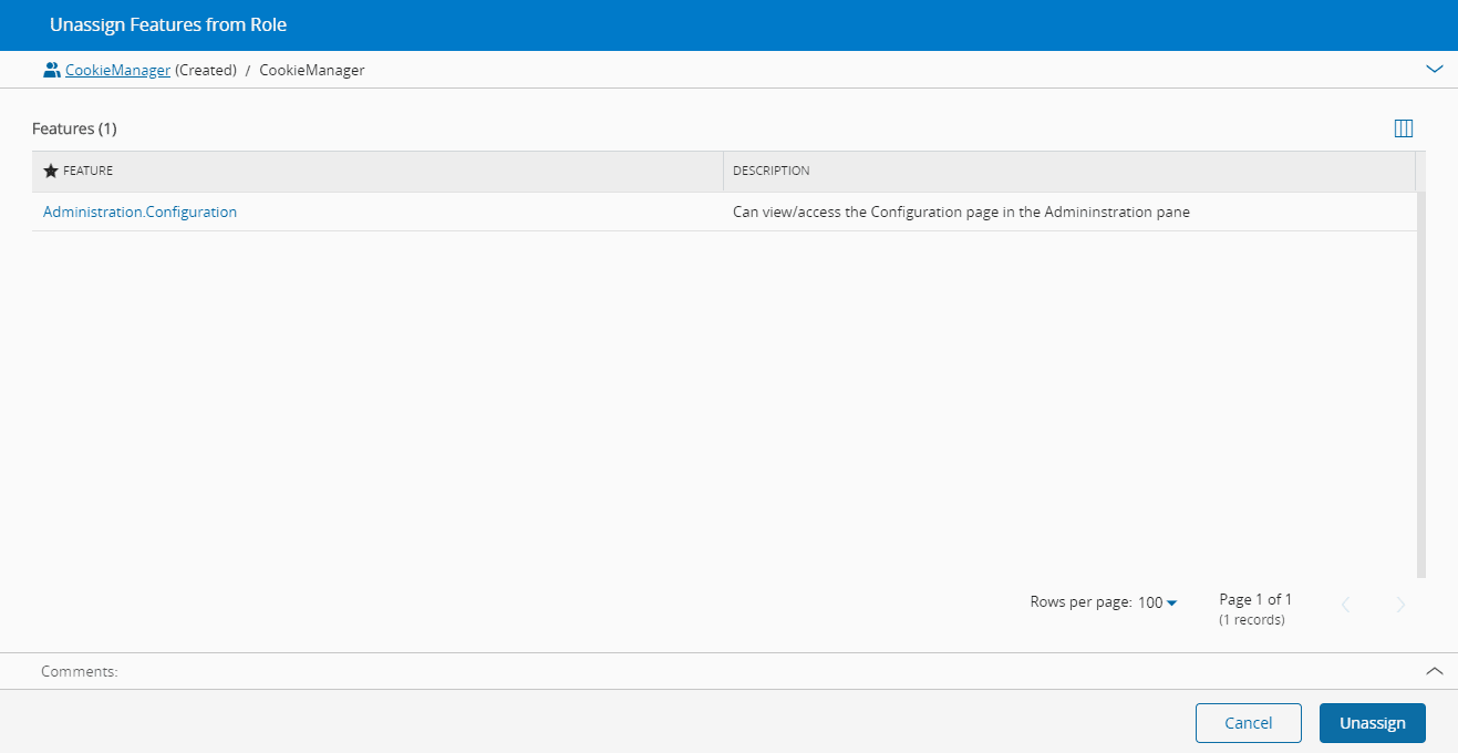- Choose the Features you wish to unassign from the Role and select the Unassign button.