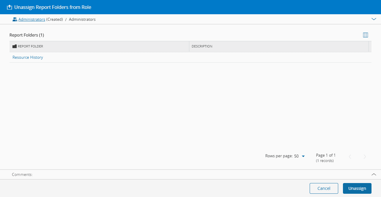 - Choose the Report Folders you wish to unassign from the Role and select the Unassign button.