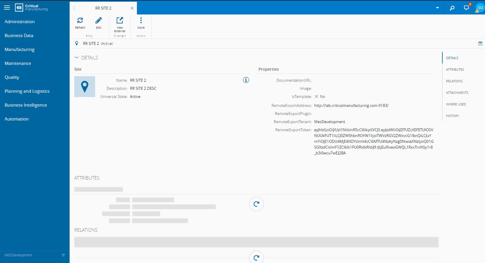 - RemoteExportAddress: public endpoint of the Critical Manufacturing MES system running on the remote site