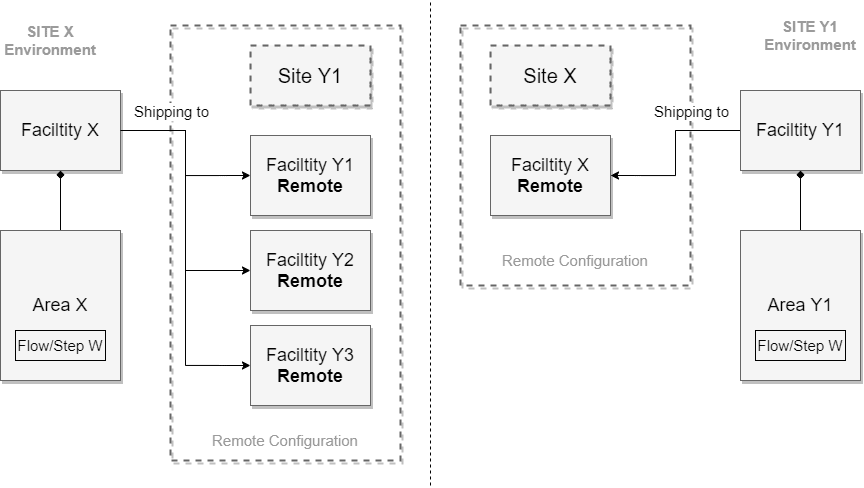 To setup this integration scenario, all modeled objects must be represented in the system for it to work properly. Remote site mapping configuration is required for each site, as well as a remote Facility (which will be a local Facility on the remote site) and the same Flow and Steps.