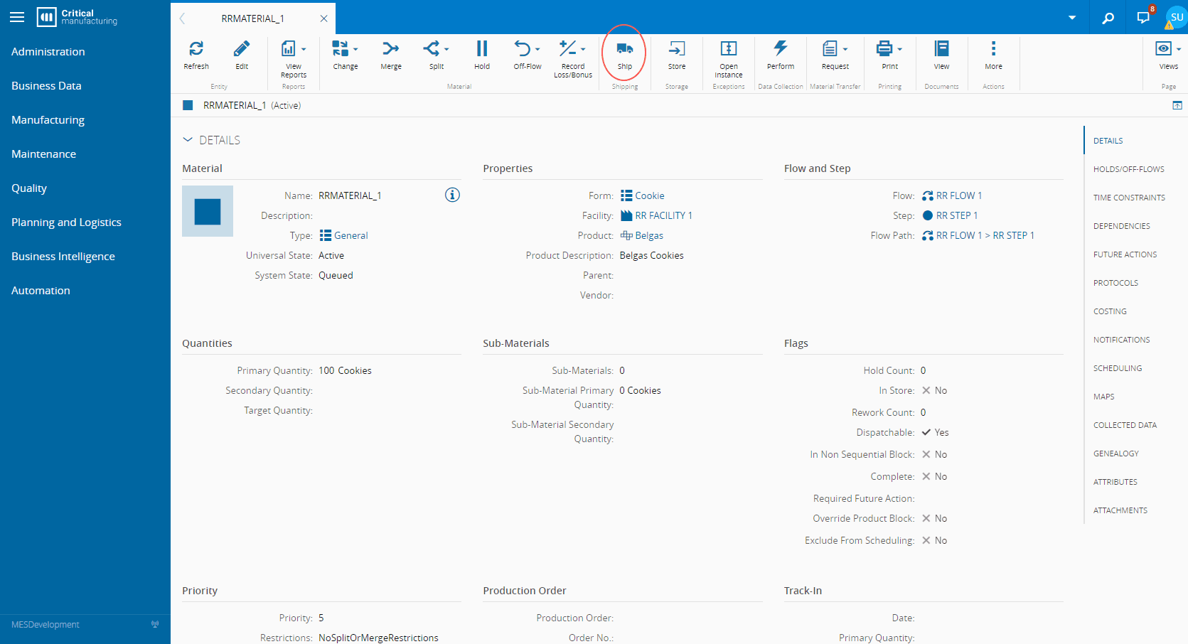 To perform a material shipment, the user needs to pick an active and queued Material. A Ship button will be available in the Material page.