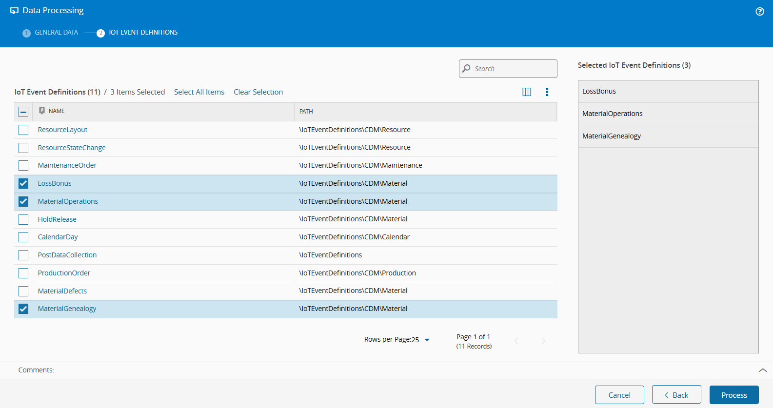 If you selected the Canonical Data Model (CDM), you can choose which IoT Event Definitions to monitor. After you made your selection, choose the Process button to complete the operation.