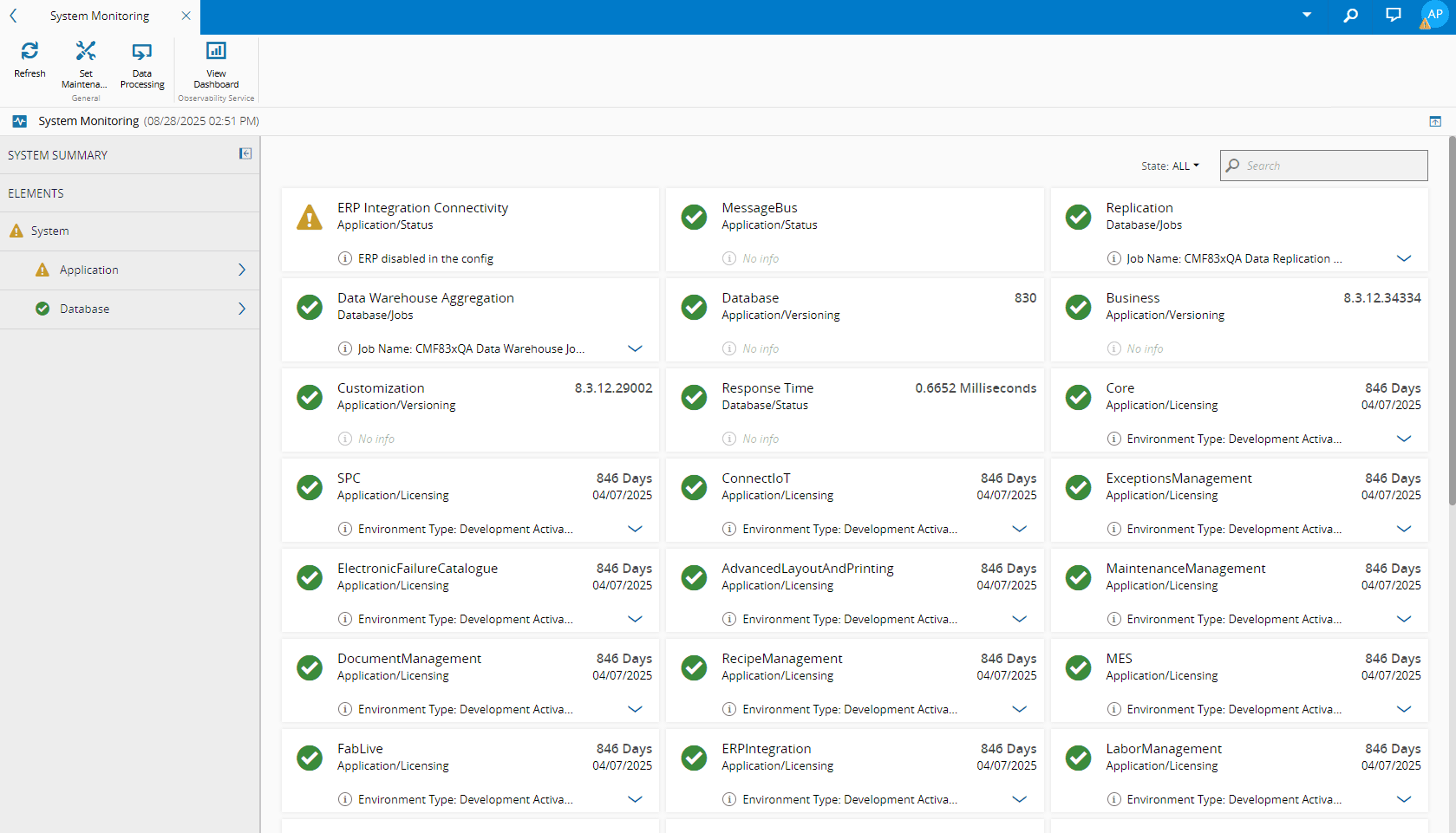 The system presents one card per component or sub-system. The status is displayed on the left, with a green check mark, indicating that the component is functioning properly, or a warning sign, if the component is not functioning correctly. Further information such as Database, Business and Customization versions may be displayed on the right or at the bottom of each card.