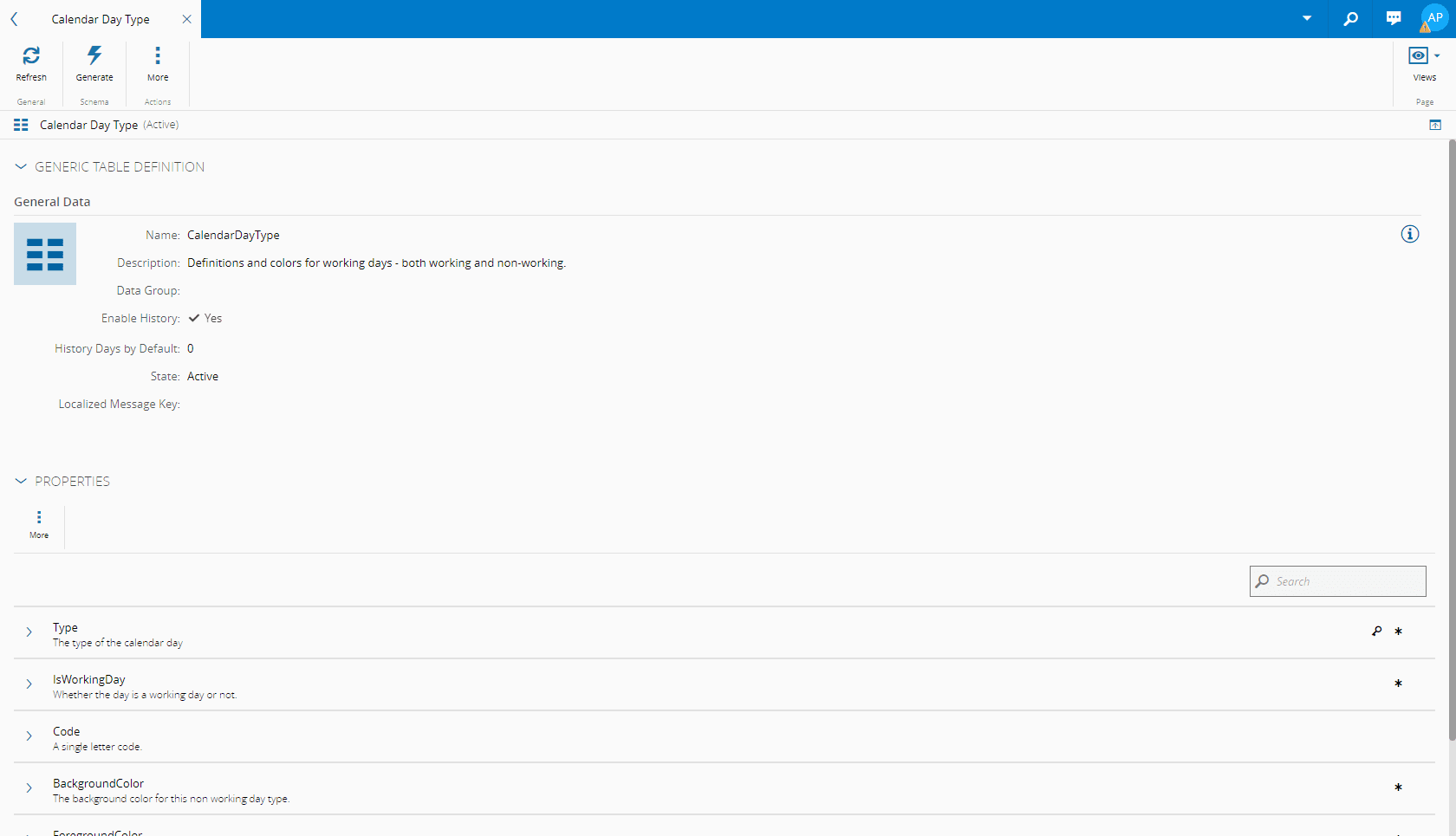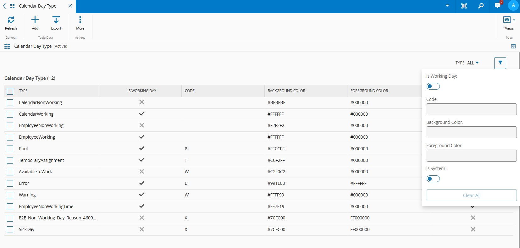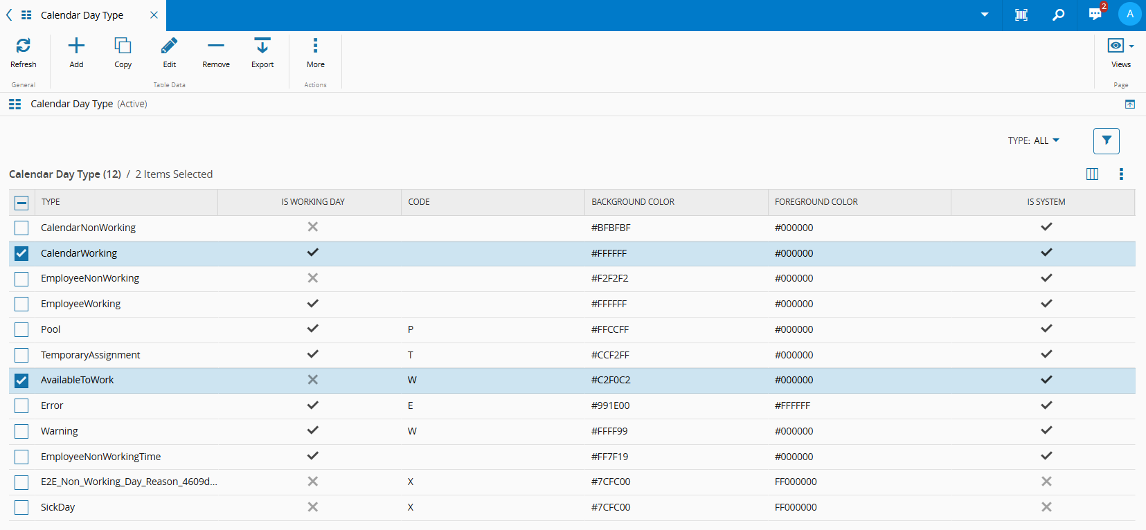 CalendarDayType Definitions and colors for working days - both working and non-working.