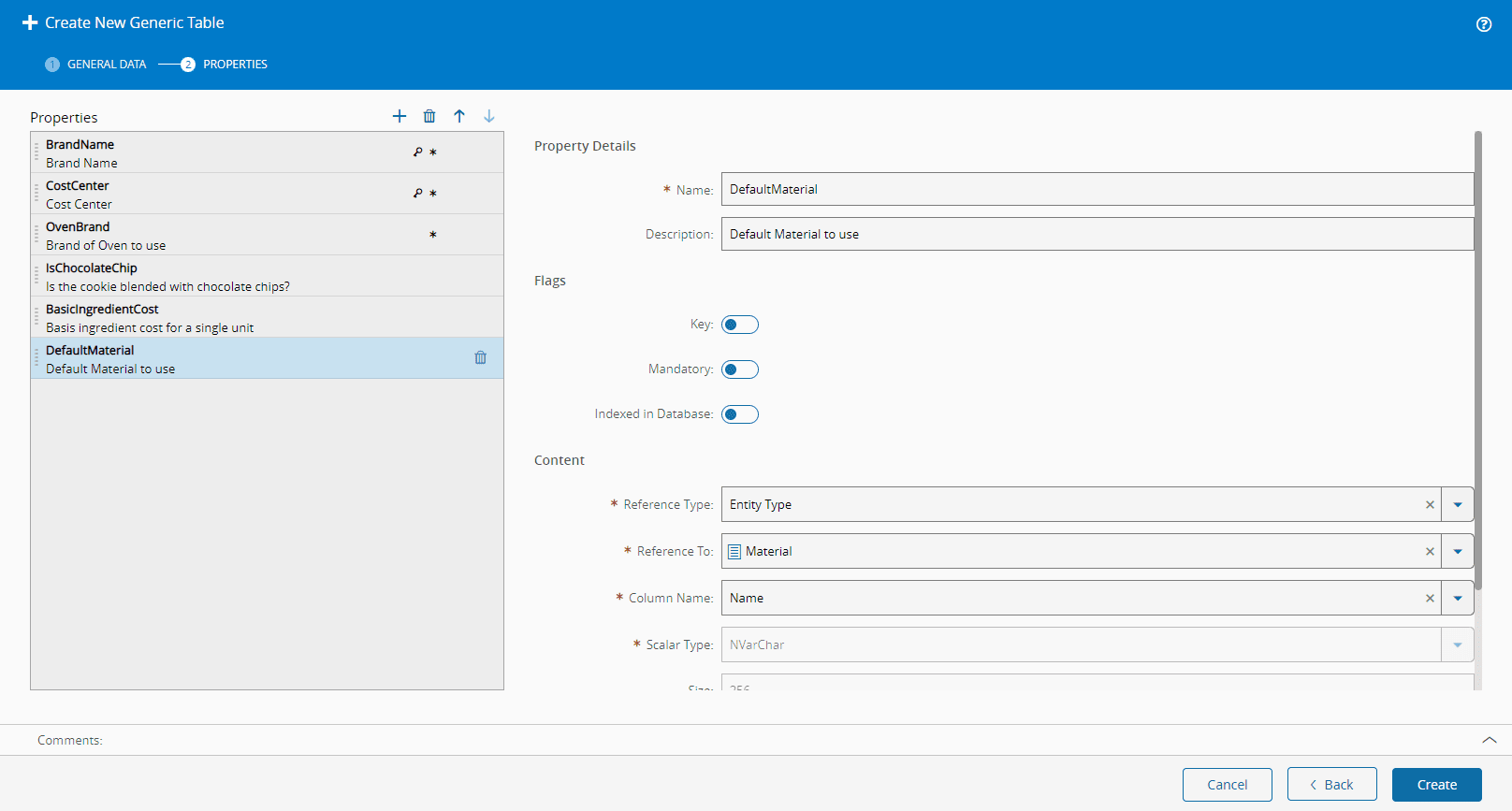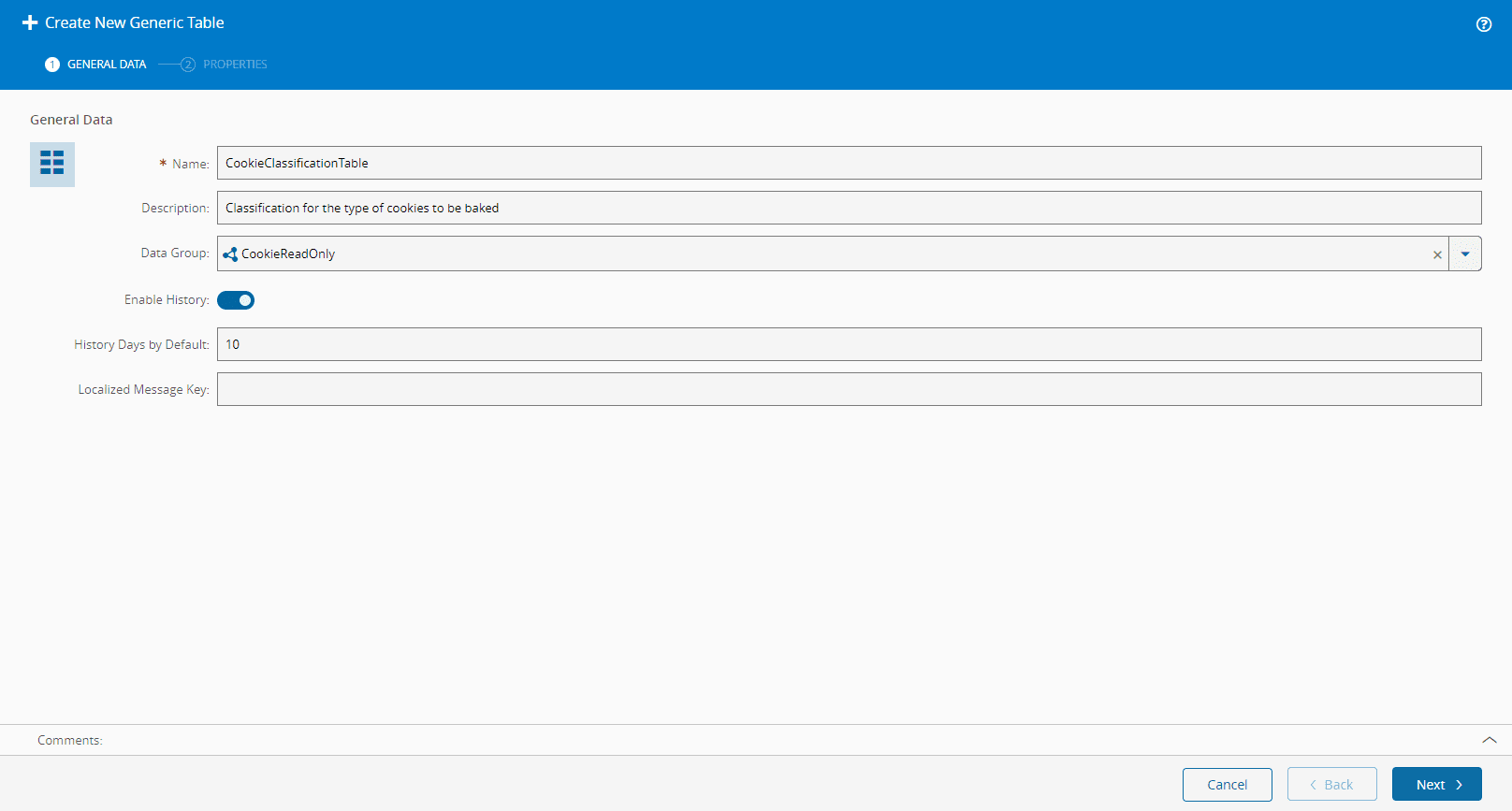 7. Select Next to define the Generic Table Properties.
