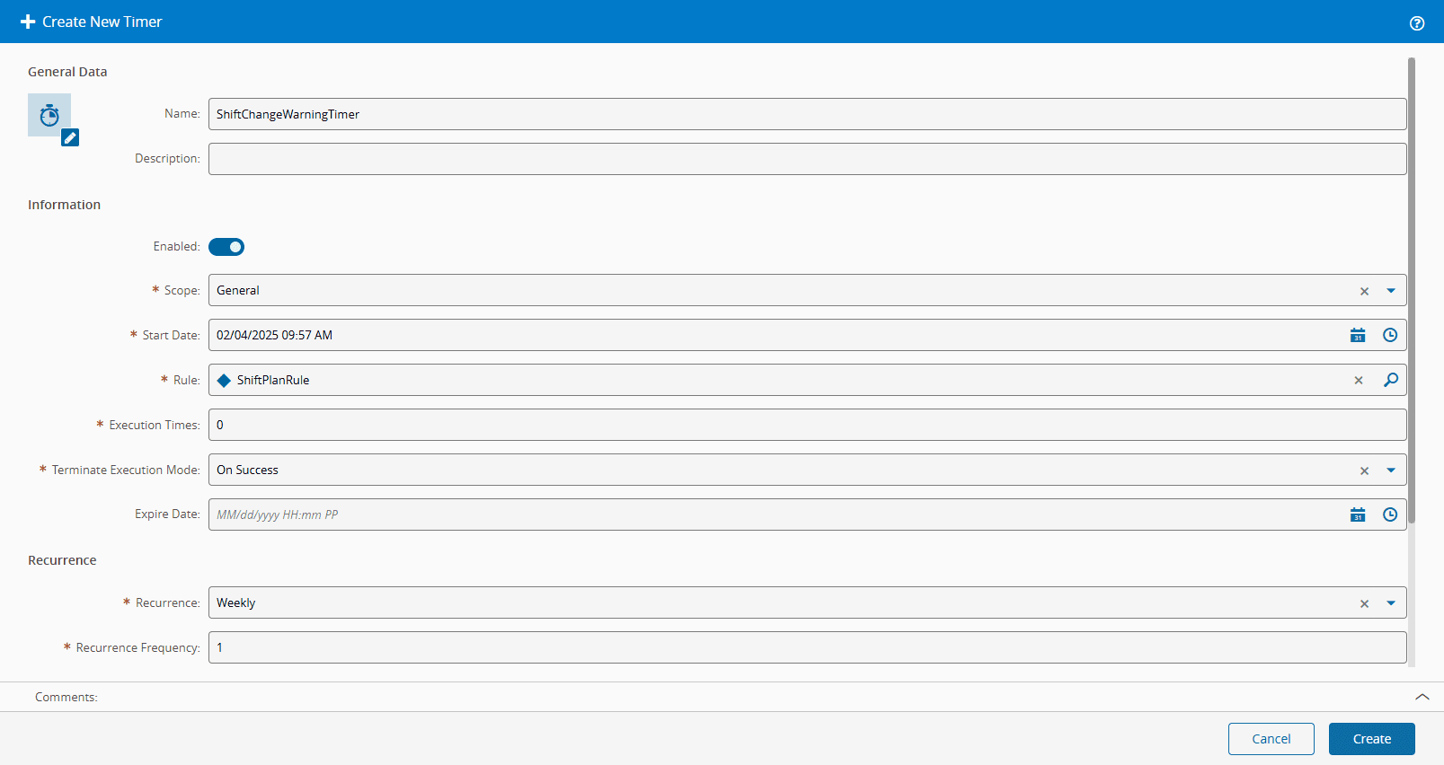 To create a new Timer, select Create on the top ribbon of the Timers page and follow the information below.