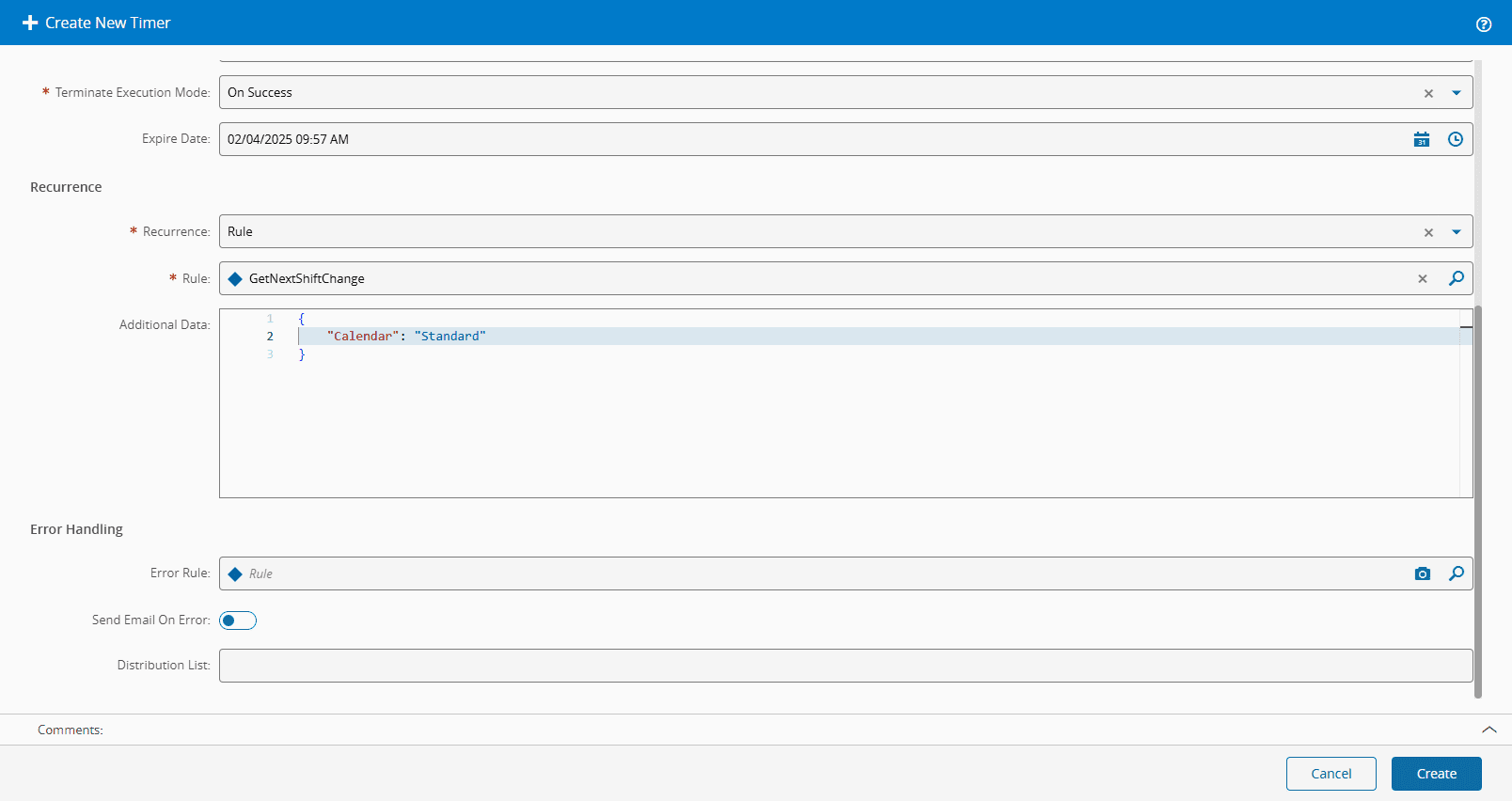This rule must receive Additional Data that is provided by the RecurrenceRuleData input. This Rule must return a date that will be the next execution date of the Timer.