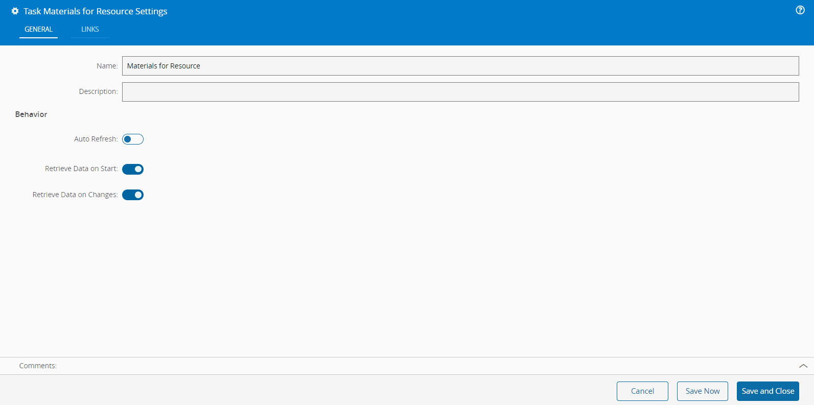 The Material Details Task retrieves additional details about the selected Material. It can be used as a dashboard task and is primarily used in the Step View and Resource View pages. To configure this task, you need to provide a name and, optionally, a description. Additionally, you can customize its behavior by adjusting the following settings: