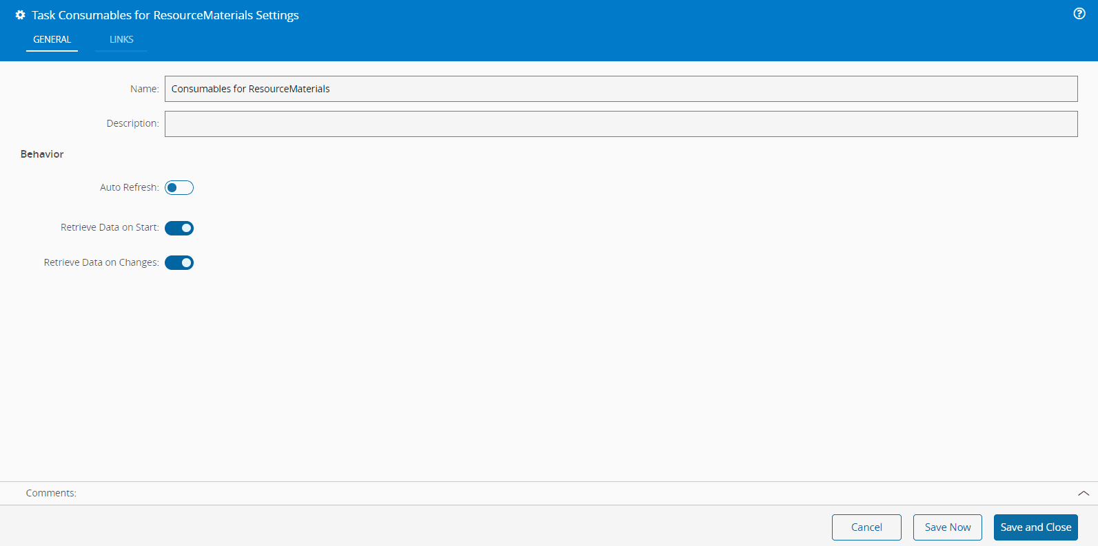 The Consumables for Resource Materials Task retrieves the Materials of type Consumable for a selected Resource. It can be used as a dashboard task and, while it is primarily used in the Fab Explorer page to obtain the Consumables of a Resource within the Resource View, it can be used in any UI Page. To configure this task, you need to provide a name and, optionally, a description. Additionally, you can customize its behavior by adjusting the following settings: