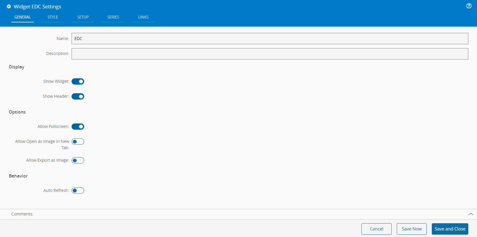 - In the General tab, provide a name and a description for the widget. Use the toggle buttons to specify whether the widget should be visible, display the header, or allow full screen mode. Additionally, determine if the widget can be opened as an image in a new tab or exported as an image. You can also select the navigation mode behavior: open a new page, replace the current page, or none.