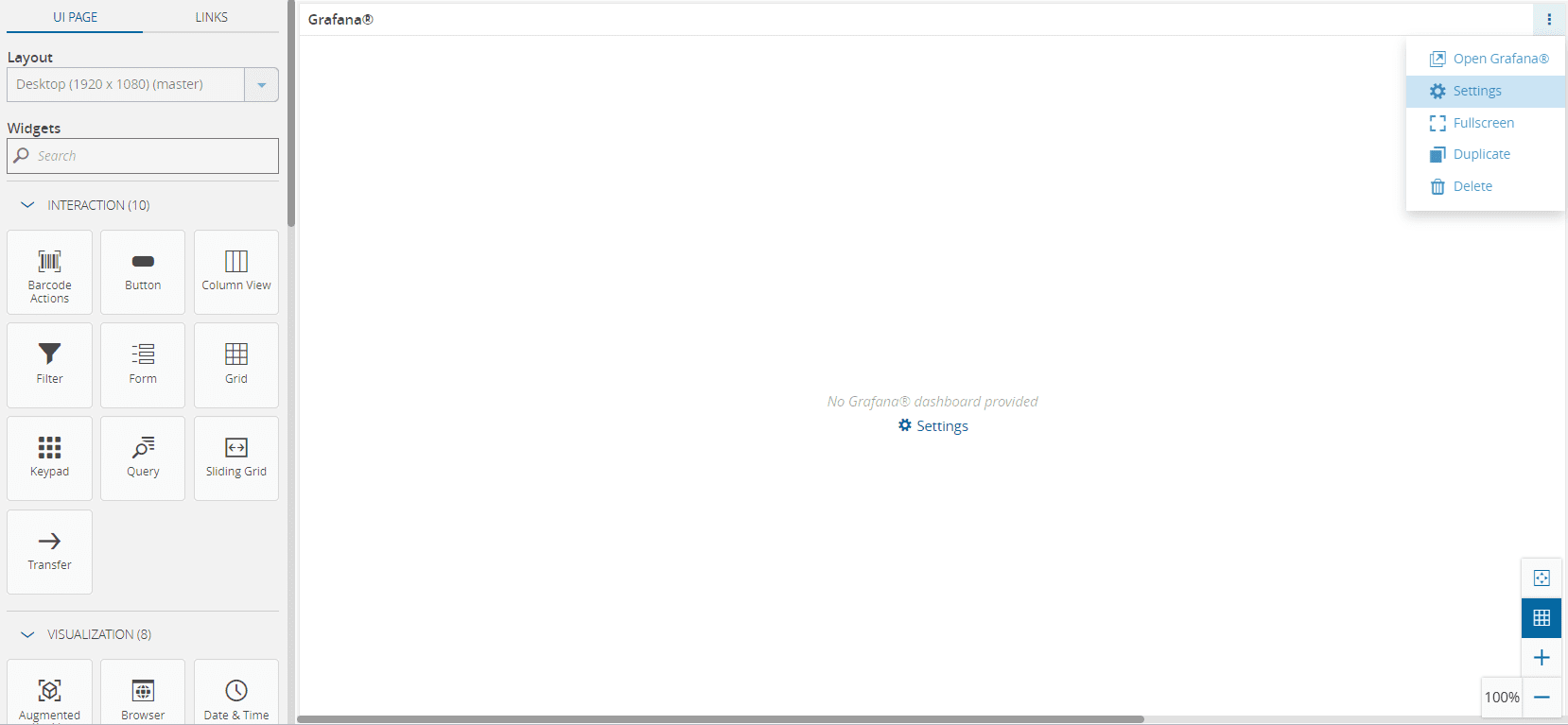 In the created UI Page, select Settings either in the More dropdown or on the center page of the Grafana widget: