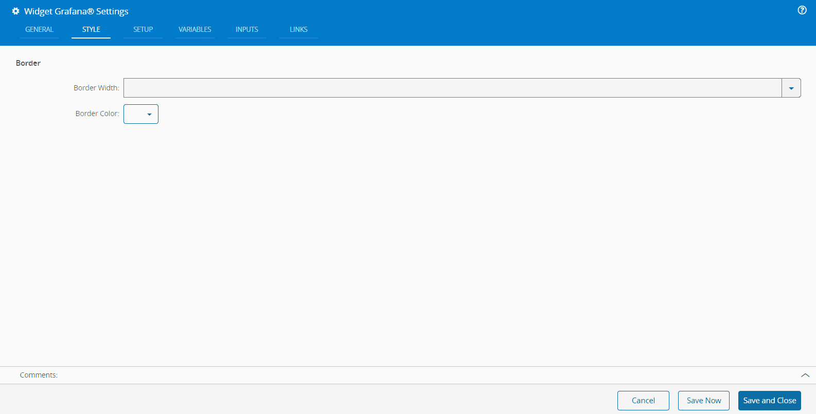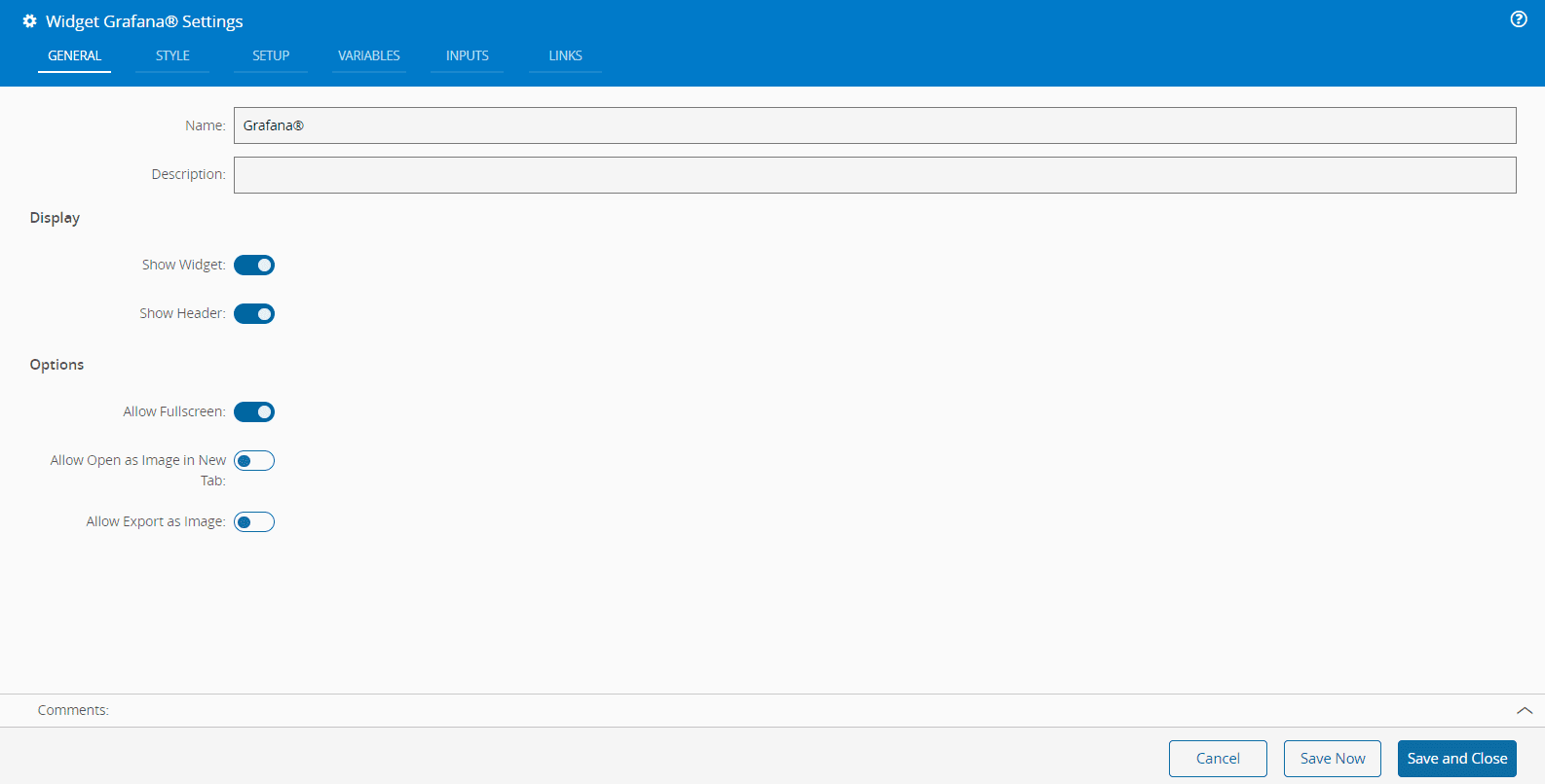 In the General tab, provide a name (Grafana by default) and a description for the widget. Use the toggle buttons to specify whether the widget should be visible, display the header, or allow full screen mode. Additionally, determine if the widget can be opened as an image in a new tab or exported as an image.