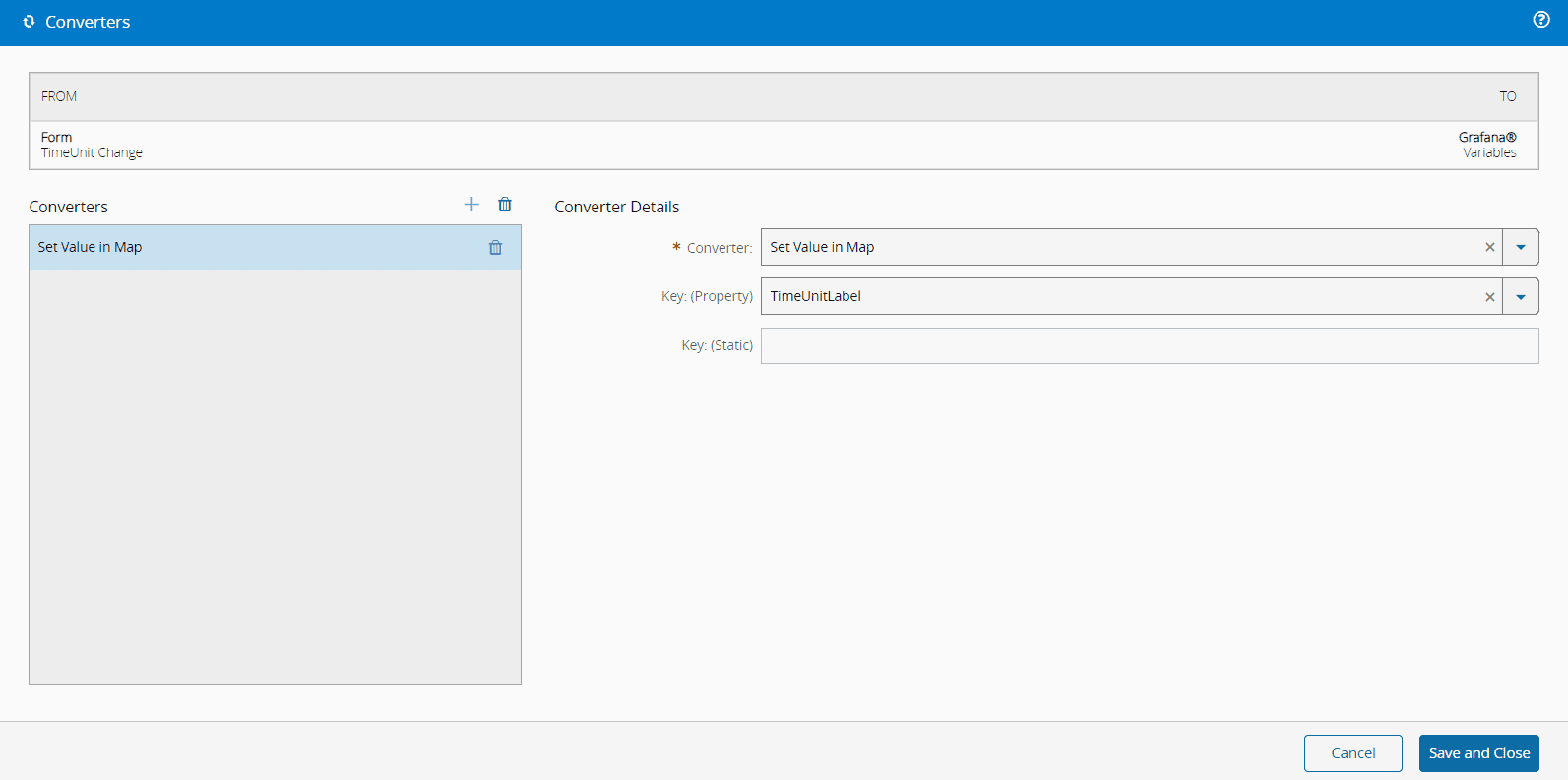 In the top ribbon, select Settings, then in the Properties tab, selected to add a new property for your TimeUnit label. Set the appropriate Name, Source, Type, and Value (key of the variable in Grafana), then Save and Close: