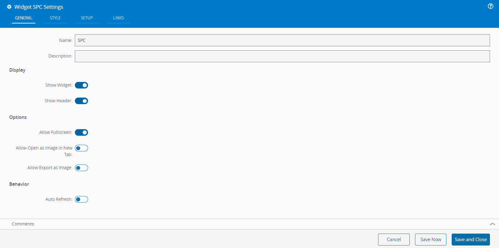 3. In the General tab, provide a name and a description for the widget. Use the toggle buttons to specify whether the widget should be visible, display the header, or allow full screen mode. Additionally, determine if the widget can be opened as an image in a new tab or exported as an image. You can the behavior of the widget by toggling the button that allow auto refresh.