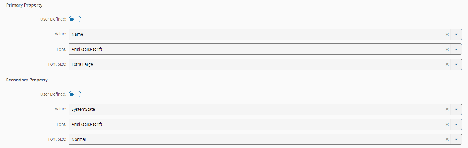 Additionally, define a Primary Property and/or a Secondary Property to be displayed, along with the Font and Font Size in which to render them. If the properties selected are not user defined, a dropdown control is available for you to select the Value of the desired property. The secondary property will be enclosed in parentheses. If the user defined flag is set, you can access contextual properties associated to a given Entity (e.g., if a Material entity is selected and you want to display the name of the Product, entering