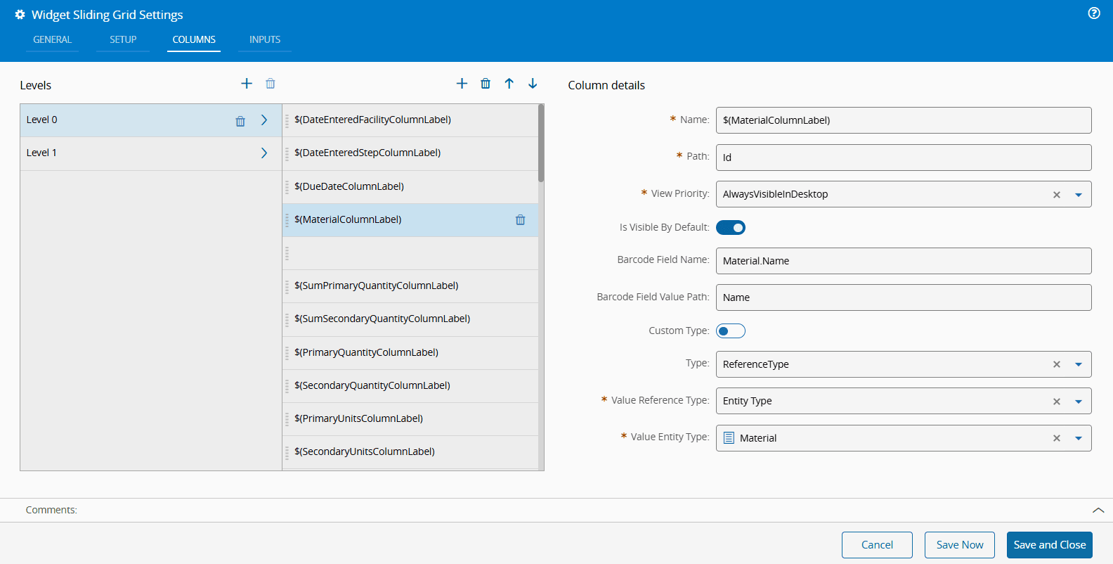In the Columns tab of the Sliding Grid Settings, identify the columns that should support barcode scanning. For this example, we will enable scanning for Material Name, Material Type, and Material Product. For each of these columns, configure both the Barcode Field Name and the Barcode Field Value Path as displayed below: