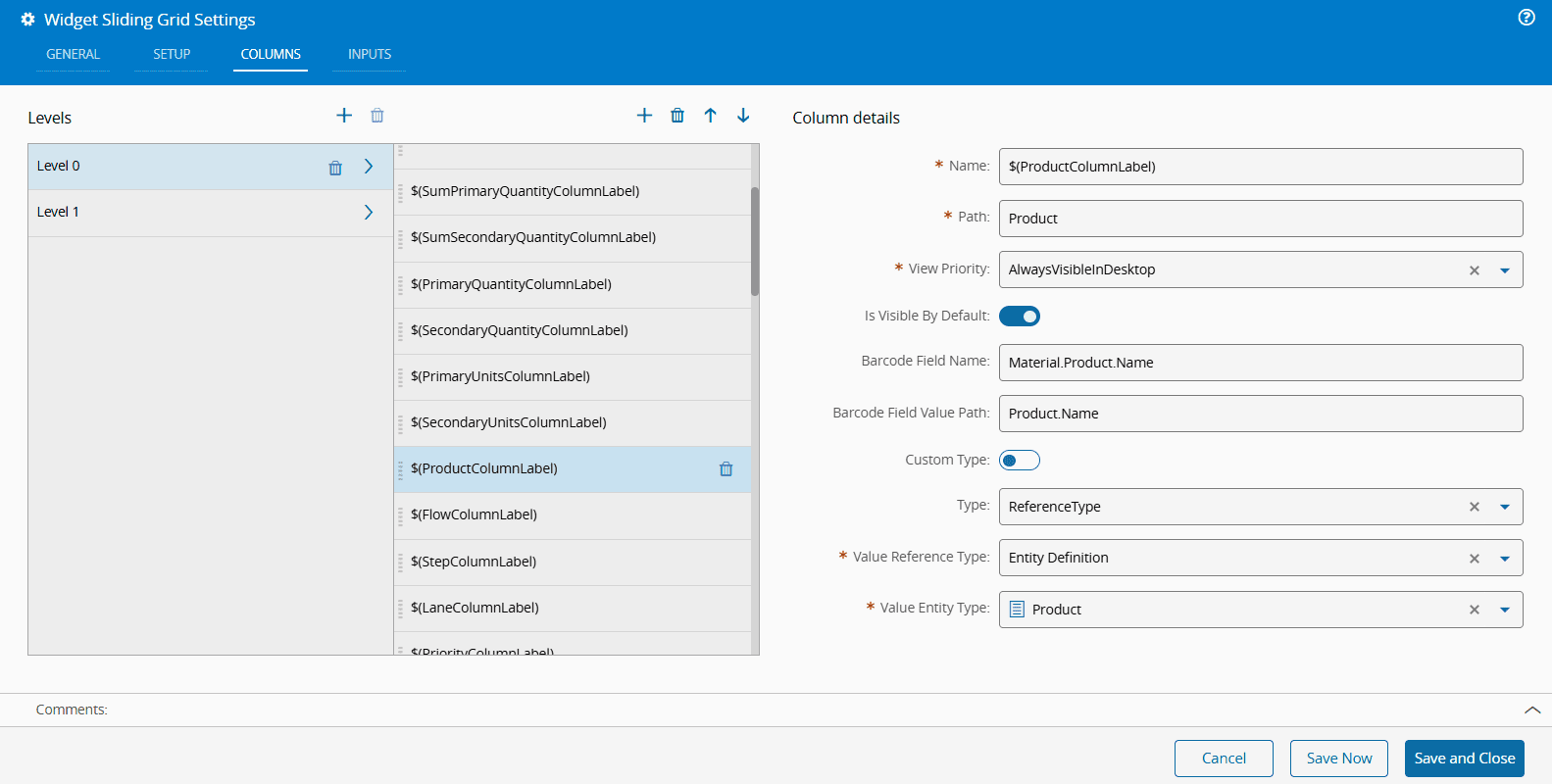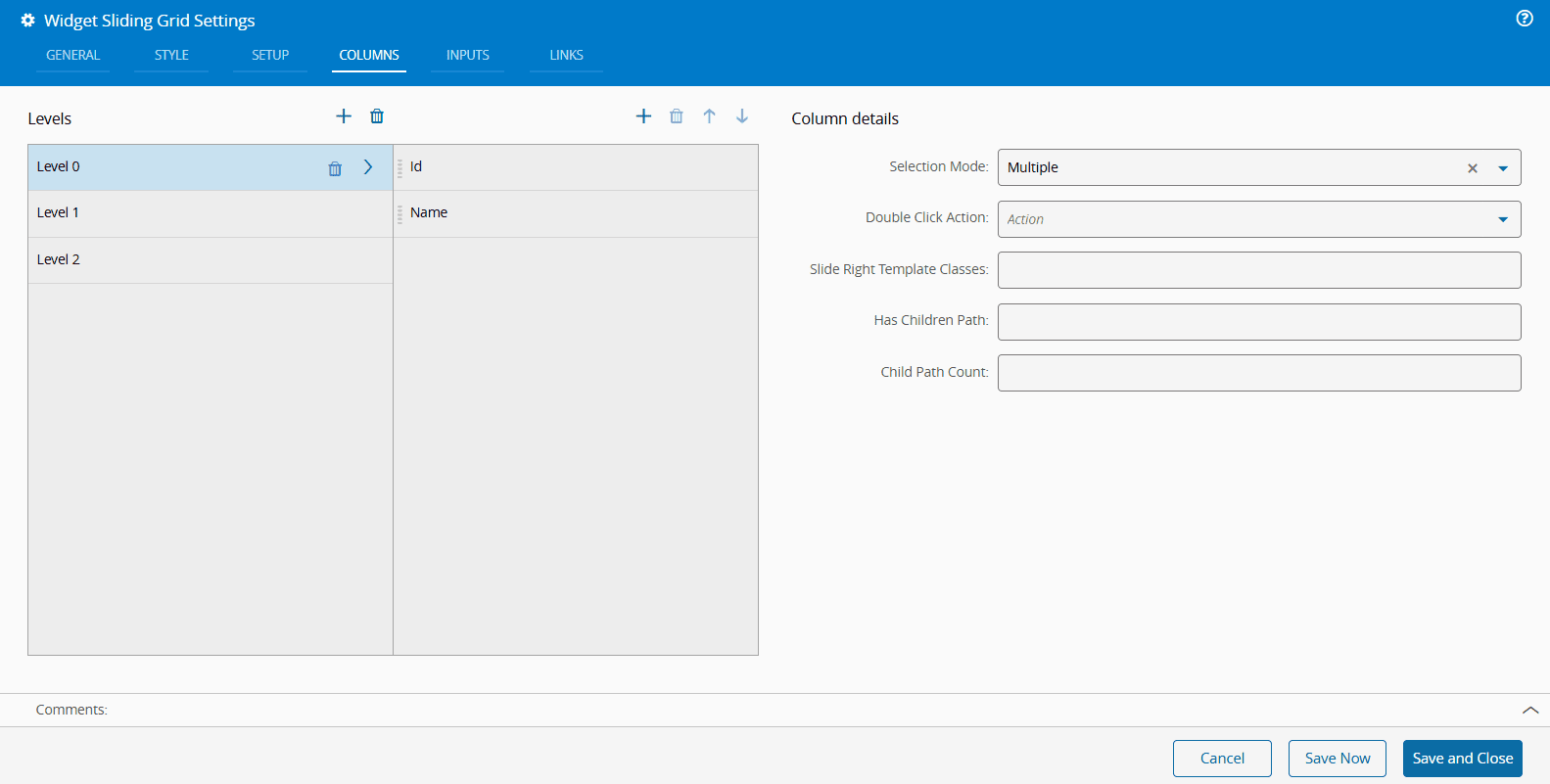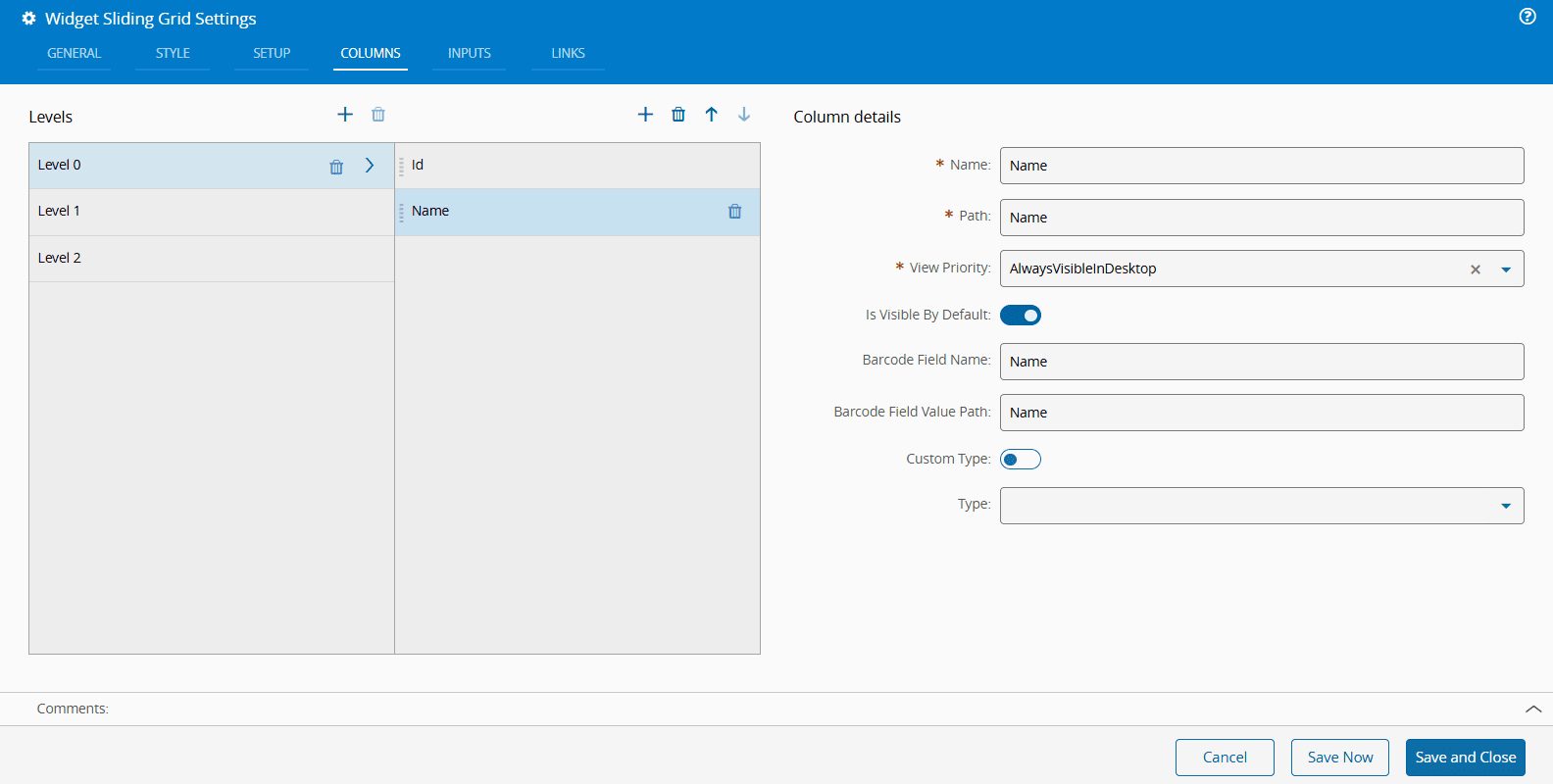 In the Columns tab, you should configure the different Levels of the Sliding Grid and the Columns to be displayed for each level. To configure the Levels details, you should provide: