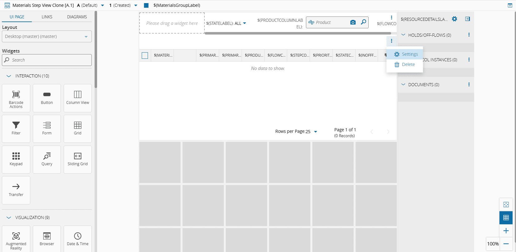 The following scenario demonstrates how to create a UI Page that allows you to search through a list of Materials using a Filter and a Sliding Grid using a barcode scanner.