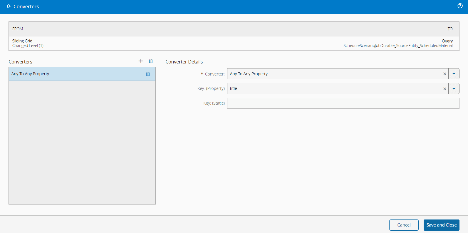In the next example, the Change Level (1) from above was connected to a Query that was created. This Query needs a parameter to filter the information, and the needed parameter is sent with the converter: