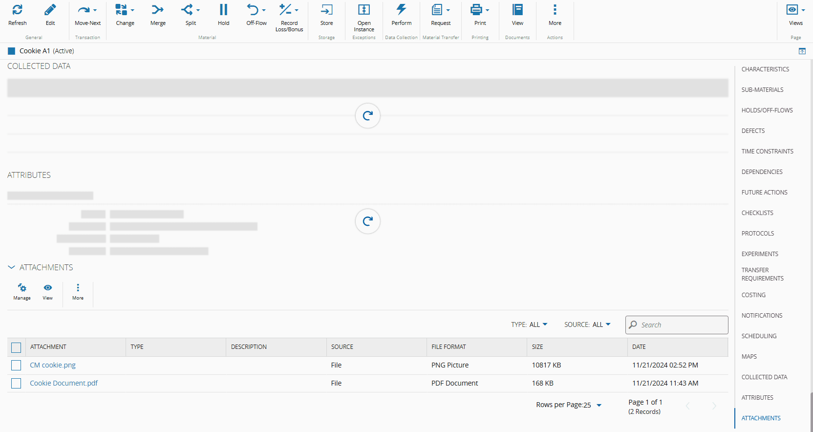 1. Add attachments to an MES entity. In this example, two attachment files (an image and a PDF file) were added to Cookie A1. For more information, see the Attachments section.