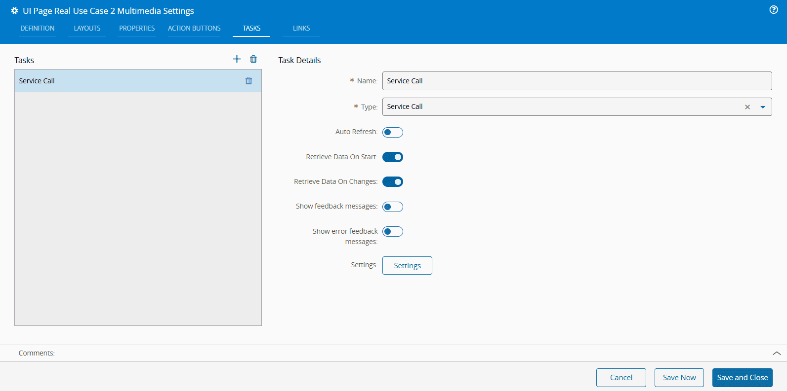 3. In the Settings wizard of the UI Page, add a new Task. Set it as a Service Call to fetch the entity attachments.